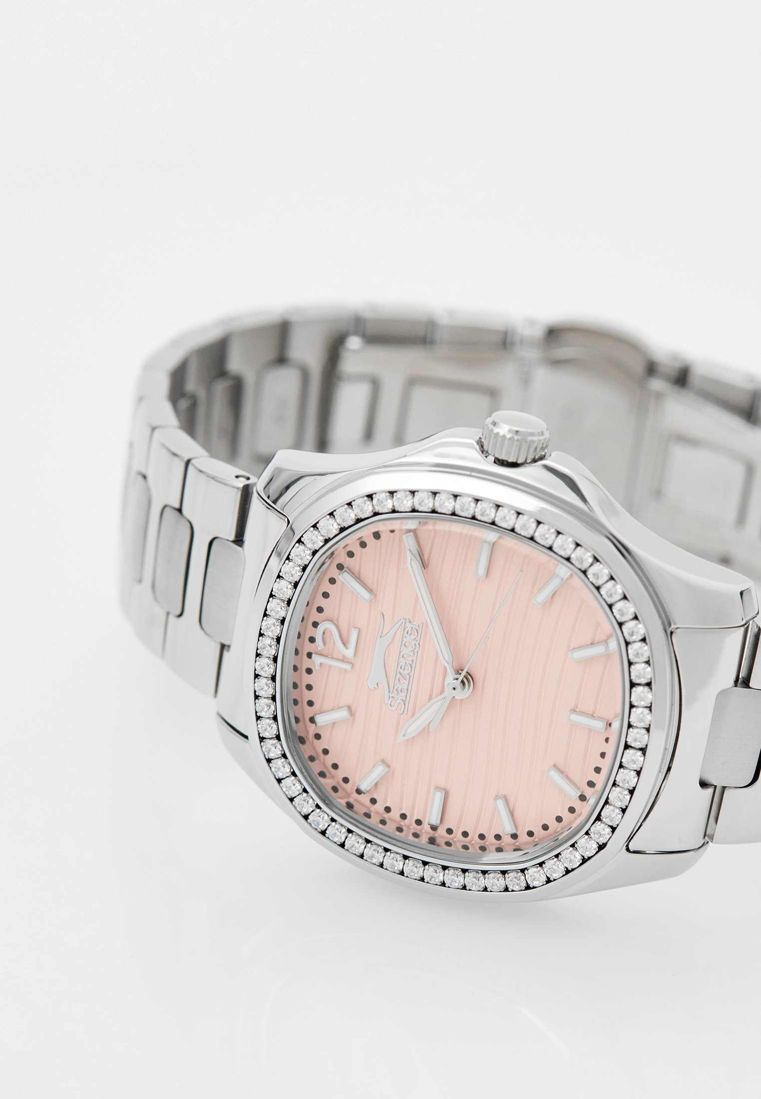 Часы Slazenger SL.09.2238.3.09 – это изысканный аксессуар, который станет стильным акцентом любого образа. Модель оснащена надежным кварцевым механизмом. Корпус из прочного металла размером 34х34 мм украшен россыпью сверкающих фианитов по безелюБезельВнешний ободок, закрепляющий стекло. В спортивных часах так называется поворотное кольцо с делениями на циферблате, выполняет роль таймера – замеряет отрезки времени на шкале. Неподвижный безель – элемент декора. Однонаправленно вращающийся безель на дайверских часах позволяет фиксировать моменты погружения и выныривания на поверхность., что придает часам особое сияние и элегантность. Розовый циферблат с логотипом бренда защищен стойким к царапинам минеральным стекломМинеральное стеклоМинеральное стекло представляет собой искусственно выращенный минерал кварца. Такое стекло отличается особой устойчивостью к повреждениям и царапинам. Уступает по некоторым качествам сапфировому стеклу.. Четкие часовые метки в виде лаконичных штрихов и крупная арабская цифра 12 обеспечивают удобство чтения времени. Заводная головка с рифлением дополнена защитой для повышения долговечности. Металлический браслет шириной 18 мм надежно фиксируется на запястье с помощью застежки «бабочка»Застёжка "бабочка"Такой вид застёжки дополняется предохранителями, помогающими избежать случайного раскрытия браслета. Обладают изящным исполнением. . Для удобства использования в темное время суток предусмотрено люминесцентное покрытиеЛюминесцентное покрытиеПозволяет считывать показания времени в темноте. Производители наносят на стрелки, часовые индексы, безель или поверхность циферблата светонакопительный состав, дающий холодное свечение. стрелок. Водозащита 30WR позволяет не беспокоиться о случайных брызгах. Вес изделия составляет 92 грамма, что делает часы комфортными для ежедневного ношения. Эти часы идеально подойдут для тех, кто ценит гармонию стиля, качества и функциональности.