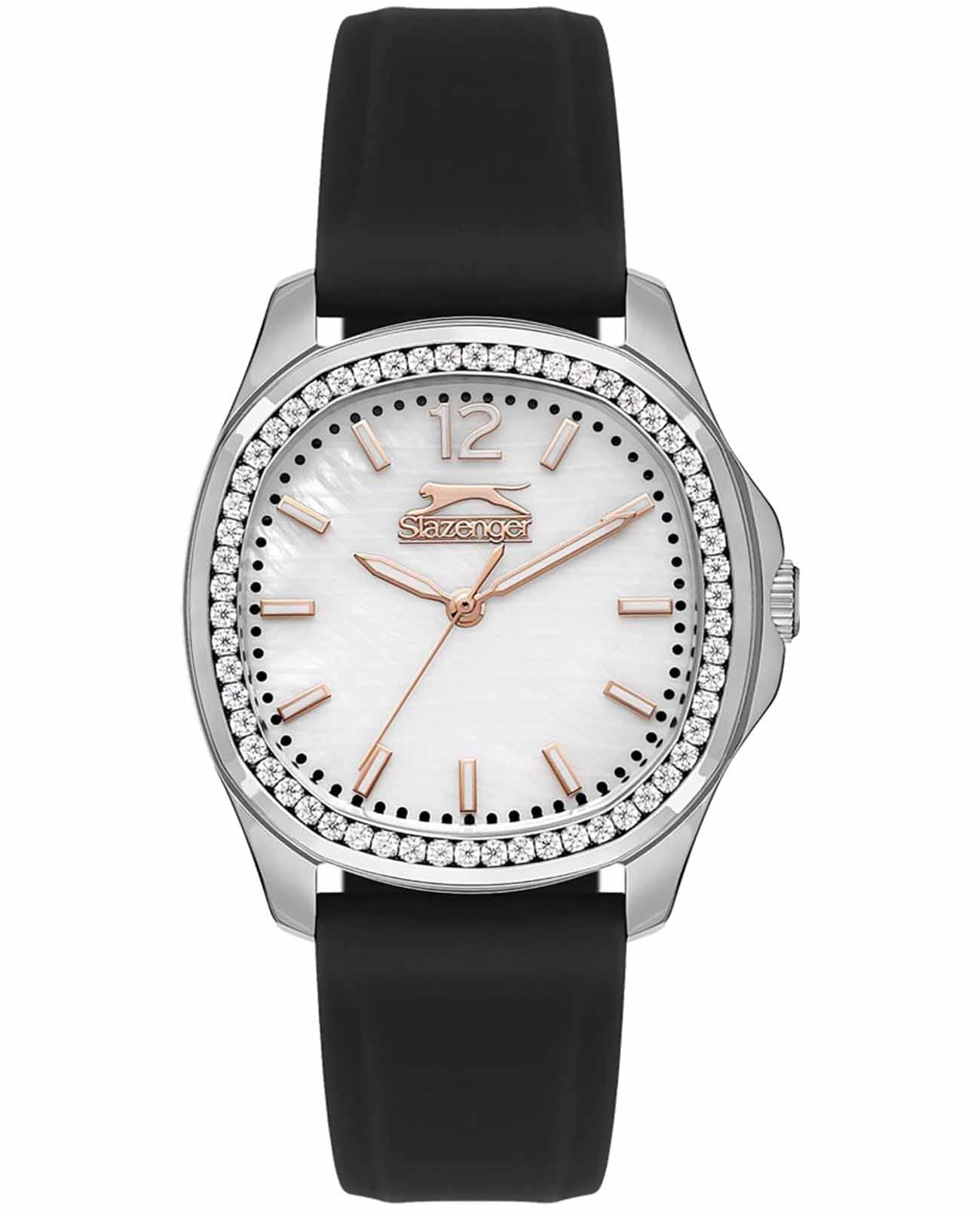 Часы Slazenger SL.09.2239.3.01 – это изысканный аксессуар, который станет стильным акцентом любого образа. Модель оснащена надежным кварцевым механизмом. Корпус из прочного металла размером 34х34 мм украшен россыпью сверкающих фианитов по безелюБезельВнешний ободок, закрепляющий стекло. В спортивных часах так называется поворотное кольцо с делениями на циферблате, выполняет роль таймера – замеряет отрезки времени на шкале. Неподвижный безель – элемент декора. Однонаправленно вращающийся безель на дайверских часах позволяет фиксировать моменты погружения и выныривания на поверхность., что придает часам особое сияние и элегантность. Белый перламутровый циферблат с логотипом бренда защищен стойким к царапинам минеральным стекломМинеральное стеклоМинеральное стекло представляет собой искусственно выращенный минерал кварца. Такое стекло отличается особой устойчивостью к повреждениям и царапинам. Уступает по некоторым качествам сапфировому стеклу.. Четкие часовые метки в виде лаконичных штрихов и крупная арабская цифра 12 обеспечивают удобство чтения времени. Заводная головка с рифлением дополнена защитой для повышения долговечности. Резиновый черный ремешок шириной 18 мм надежно фиксируется на запястье с помощью классической застежки. Для удобства использования в темное время суток предусмотрено люминесцентное покрытиеЛюминесцентное покрытиеПозволяет считывать показания времени в темноте. Производители наносят на стрелки, часовые индексы, безель или поверхность циферблата светонакопительный состав, дающий холодное свечение. стрелок. Водозащита 30WR позволяет не беспокоиться о случайных брызгах. Вес изделия составляет 43 грамма, что делает часы комфортными для ежедневного ношения. Эти часы идеально подойдут для тех, кто ценит гармонию стиля, качества и функциональности.