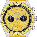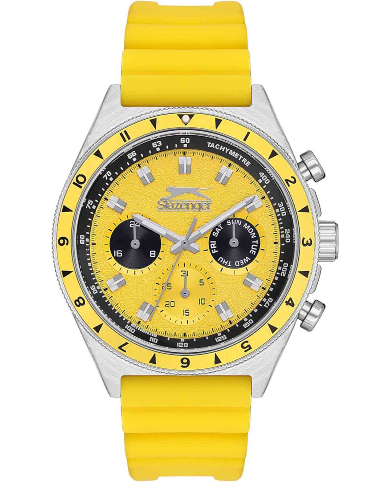 Часы Slazenger SL.09.2247.2.05 — это современная модель с выразительным спортивным характером, идеально подходящая для активного образа жизни. Корпус выполнен из прочного металла, желтый циферблат защищён минеральным стекломМинеральное стеклоМинеральное стекло представляет собой искусственно выращенный минерал кварца. Такое стекло отличается особой устойчивостью к повреждениям и царапинам. Уступает по некоторым качествам сапфировому стеклу., устойчивым к царапинам. Часы также оснащены шкалой тахиметраТахиметрРазмеченная шкала, располагается на ободке или безеле часов. Тахиметр позволяет рассчитать скорость на определённом участке пути, расстояние измеряется в километрах или милях., что добавляет им функциональности и может быть полезно для измерения скорости.  На безельБезельВнешний ободок, закрепляющий стекло. В спортивных часах так называется поворотное кольцо с делениями на циферблате, выполняет роль таймера – замеряет отрезки времени на шкале. Неподвижный безель – элемент декора. Однонаправленно вращающийся безель на дайверских часах позволяет фиксировать моменты погружения и выныривания на поверхность. нанесено желтое IP-покрытиеIP-покрытиеМетод ионного напыления. Демонстрирует повышенную устойчивость к истиранию, окислению и химическим веществам. Под воздействием высокого давления и температуры около 1500°C молекулы металла надёжно соединяются с частицами корпуса часов..  Диаметр корпуса составляет 46 мм, толщина — 11 мм, а ширина ремешка — 22 мм. Лёгкий и комфортный желтый резиновый ремешок оснащён классической застёжкой, благодаря чему часы удобно сидят на руке и не вызывают дискомфорта даже при длительном ношении. Вес модели составляет всего 79 грамм. Надёжный кварцевый механизм обеспечивает точность времени, а уровень водозащиты WR 50 позволяет использовать часы в повседневных условиях, не опасаясь случайных брызг или дождя. Для удобства использования в темное время суток предусмотрено люминесцентное покрытиеЛюминесцентное покрытиеПозволяет считывать показания времени в темноте. Производители наносят на стрелки, часовые индексы, безель или поверхность циферблата светонакопительный состав, дающий холодное свечение. стрелок и меток. Дополнительные малые циферблаты показывают дату, день недели и текущее время в 24-часовом формате, что делает использование часов ещё более удобным и функциональным.