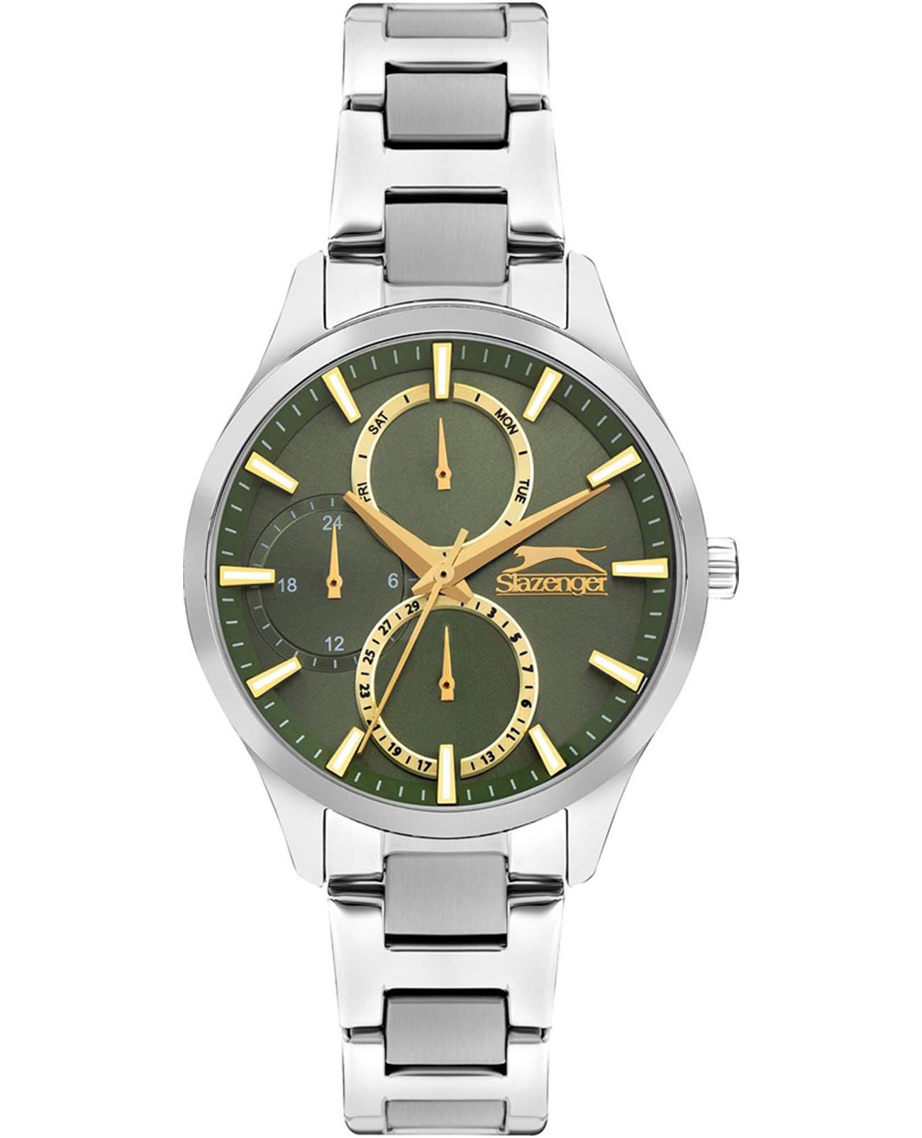 Часы Slazenger SL.09.2284.4.03 — это изящный и функциональный аксессуар, который гармонично дополнит ваш образ и подчеркнет индивидуальность. Корпус и браслет выполнены из инновационного суперметалла — сплава на основе меди с пониженным содержанием цинка и никеля, что обеспечивает долговечность и надежную защиту от внешних воздействий. Зеленый циферблат, защищенный прочным минеральным стекломМинеральное стеклоМинеральное стекло представляет собой искусственно выращенный минерал кварца. Такое стекло отличается особой устойчивостью к повреждениям и царапинам. Уступает по некоторым качествам сапфировому стеклу., оснащен дополнительными индикаторами: отдельные циферблаты отображают 24-часовой формат времени, текущую дату и день недели, что делает использование часов максимально удобным в повседневной жизни. Диаметр корпуса составляет 35 мм, а толщина — 11 мм, благодаря чему модель комфортно располагается на запястье. Браслет с раскладной застёжкойРаскладная застёжкаТакой тип застёжки используется только на браслетах из металла. Она никогда не раскрывается полностью, происходит разделение на 2 и более частей. Раскладывающая застёжка снизит вероятность потери часов к минимуму. обеспечивает комфортную посадку. Метки с люминесцентным покрытиемЛюминесцентное покрытиеПозволяет считывать показания времени в темноте. Производители наносят на стрелки, часовые индексы, безель или поверхность циферблата светонакопительный состав, дающий холодное свечение. удобно подсвечиваются в темноте после зарядки на свету.  Класс водонепроницаемости 3 атм защищает механизм от случайных брызг и капель дождя. Кварцевый механизм гарантирует точность хода и простоту эксплуатации.