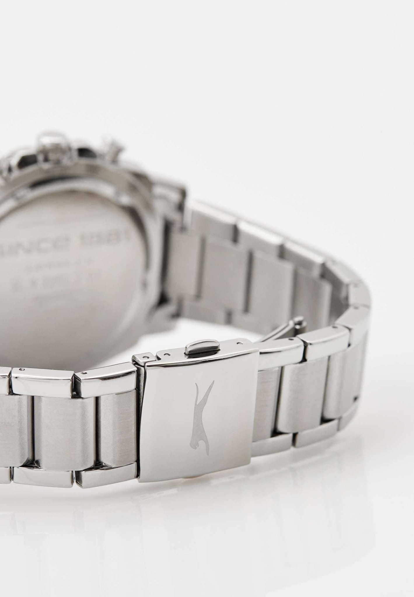 Slazenger SL.09.2292.2.03 — это стильные наручные часы, выполненные в современном дизайне и отлично подходящие для повседневного использования. Корпус диаметром 45 мм изготовлен из прочного металла и дополнен минеральным стекломМинеральное стеклоМинеральное стекло представляет собой искусственно выращенный минерал кварца. Такое стекло отличается особой устойчивостью к повреждениям и царапинам. Уступает по некоторым качествам сапфировому стеклу., которое защищает зеленый циферблат. Серебристый металлический браслет шириной 24 мм оснащён надежной раскладной застёжкойРаскладная застёжкаТакой тип застёжки используется только на браслетах из металла. Она никогда не раскрывается полностью, происходит разделение на 2 и более частей. Раскладывающая застёжка снизит вероятность потери часов к минимуму., которая обеспечивает комфортную посадку на руке. Кварцевый механизм гарантирует точный ход, а водозащита уровня WR 50 позволяет не снимать часы во время мытья рук или под дождём. Модель оснащена люминесцентным покрытиемЛюминесцентное покрытиеПозволяет считывать показания времени в темноте. Производители наносят на стрелки, часовые индексы, безель или поверхность циферблата светонакопительный состав, дающий холодное свечение. стрелок и меток, что облегчает считывание времени в темноте. Дополнительные малые циферблаты отображают дату, день недели и текущее время в 24-часовом формате. Часы также оснащены заводной головкой с защитой и безелемБезельВнешний ободок, закрепляющий стекло. В спортивных часах так называется поворотное кольцо с делениями на циферблате, выполняет роль таймера – замеряет отрезки времени на шкале. Неподвижный безель – элемент декора. Однонаправленно вращающийся безель на дайверских часах позволяет фиксировать моменты погружения и выныривания на поверхность. с зеленым IP-покрытиемIP-покрытиеМетод ионного напыления. Демонстрирует повышенную устойчивость к истиранию, окислению и химическим веществам. Под воздействием высокого давления и температуры около 1500°C молекулы металла надёжно соединяются с частицами корпуса часов. и секундной разметкой. Вес изделия составляет 173 грамма.