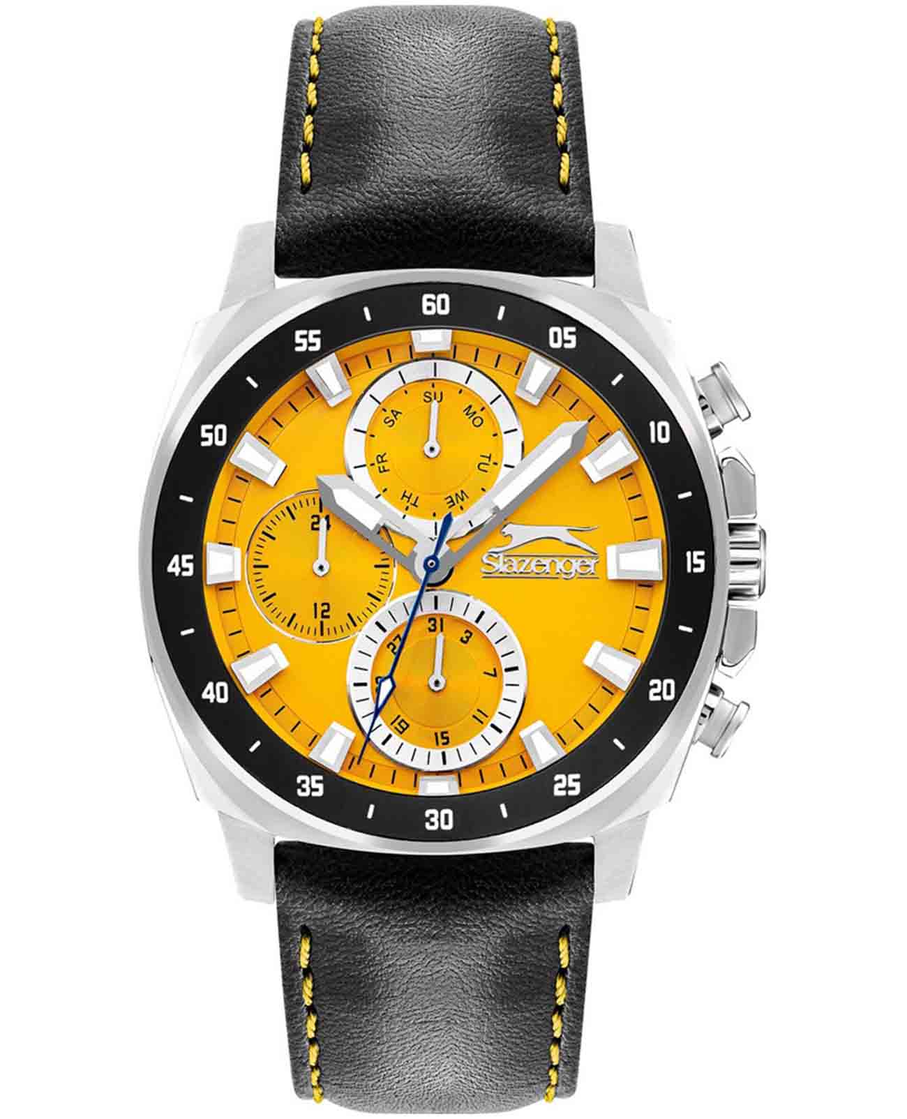 Slazenger SL.09.2293.2.05 — это стильные наручные часы, выполненные в современном дизайне и отлично подходящие для повседневного использования. Корпус диаметром 45 мм изготовлен из прочного металла и дополнен минеральным стекломМинеральное стеклоМинеральное стекло представляет собой искусственно выращенный минерал кварца. Такое стекло отличается особой устойчивостью к повреждениям и царапинам. Уступает по некоторым качествам сапфировому стеклу., которое защищает желтый циферблат. Черный кожаный ремешок шириной 24 мм оснащён надежной классической застежкой, которая обеспечивает комфортную посадку на руке. Кварцевый механизм гарантирует точный ход, а водозащита уровня WR 50 позволяет не снимать часы во время мытья рук или под дождём. Модель оснащена люминесцентным покрытиемЛюминесцентное покрытиеПозволяет считывать показания времени в темноте. Производители наносят на стрелки, часовые индексы, безель или поверхность циферблата светонакопительный состав, дающий холодное свечение. стрелок и меток, что облегчает считывание времени в темноте. Дополнительные малые циферблаты отображают дату, день недели и текущее время в 24-часовом формате. Часы также оснащены заводной головкой с защитой и безелемБезельВнешний ободок, закрепляющий стекло. В спортивных часах так называется поворотное кольцо с делениями на циферблате, выполняет роль таймера – замеряет отрезки времени на шкале. Неподвижный безель – элемент декора. Однонаправленно вращающийся безель на дайверских часах позволяет фиксировать моменты погружения и выныривания на поверхность. с черным IP-покрытиемIP-покрытиеМетод ионного напыления. Демонстрирует повышенную устойчивость к истиранию, окислению и химическим веществам. Под воздействием высокого давления и температуры около 1500°C молекулы металла надёжно соединяются с частицами корпуса часов. и секундной разметкой. Вес изделия составляет 80 грамм.