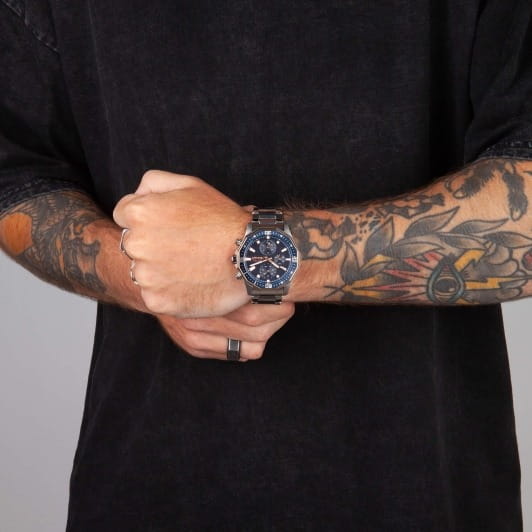 Стильные наручные часы Slazenger SL.09.2297.2.03 созданы для ценителей надежности и современного дизайна. Классический металлический корпус и серебристый браслет гармонично сочетают элегантность и практичность. Кварцевый механизм обеспечивает точность хода, а минеральное стеклоМинеральное стеклоМинеральное стекло представляет собой искусственно выращенный минерал кварца. Такое стекло отличается особой устойчивостью к повреждениям и царапинам. Уступает по некоторым качествам сапфировому стеклу. защищает циферблат от царапин. Особое внимание привлекает безельБезельВнешний ободок, закрепляющий стекло. В спортивных часах так называется поворотное кольцо с делениями на циферблате, выполняет роль таймера – замеряет отрезки времени на шкале. Неподвижный безель – элемент декора. Однонаправленно вращающийся безель на дайверских часах позволяет фиксировать моменты погружения и выныривания на поверхность. с синим IP-покрытиемIP-покрытиеМетод ионного напыления. Демонстрирует повышенную устойчивость к истиранию, окислению и химическим веществам. Под воздействием высокого давления и температуры около 1500°C молекулы металла надёжно соединяются с частицами корпуса часов.. На дополнительных малых циферблатах отображаются день недели, число и текущее время в 24-часовом формате. Модель оснащена люминесцентным покрытиемЛюминесцентное покрытиеПозволяет считывать показания времени в темноте. Производители наносят на стрелки, часовые индексы, безель или поверхность циферблата светонакопительный состав, дающий холодное свечение. стрелок и меток, что облегчает считывание времени в темноте. Водозащита 50 метров позволяет не снимать часы во время дождя или мытья рук. Заводная головка оснащена защитой, а задняя крышка завинчивается для дополнительной безопасности. Браслет снабжен удобной раскладной застёжкойРаскладная застёжкаТакой тип застёжки используется только на браслетах из металла. Она никогда не раскрывается полностью, происходит разделение на 2 и более частей. Раскладывающая застёжка снизит вероятность потери часов к минимуму.. Диаметр корпуса составляет 43 мм, толщина — 13 мм, ширина ремешка 22 мм, а вес часов — 167 грамм.