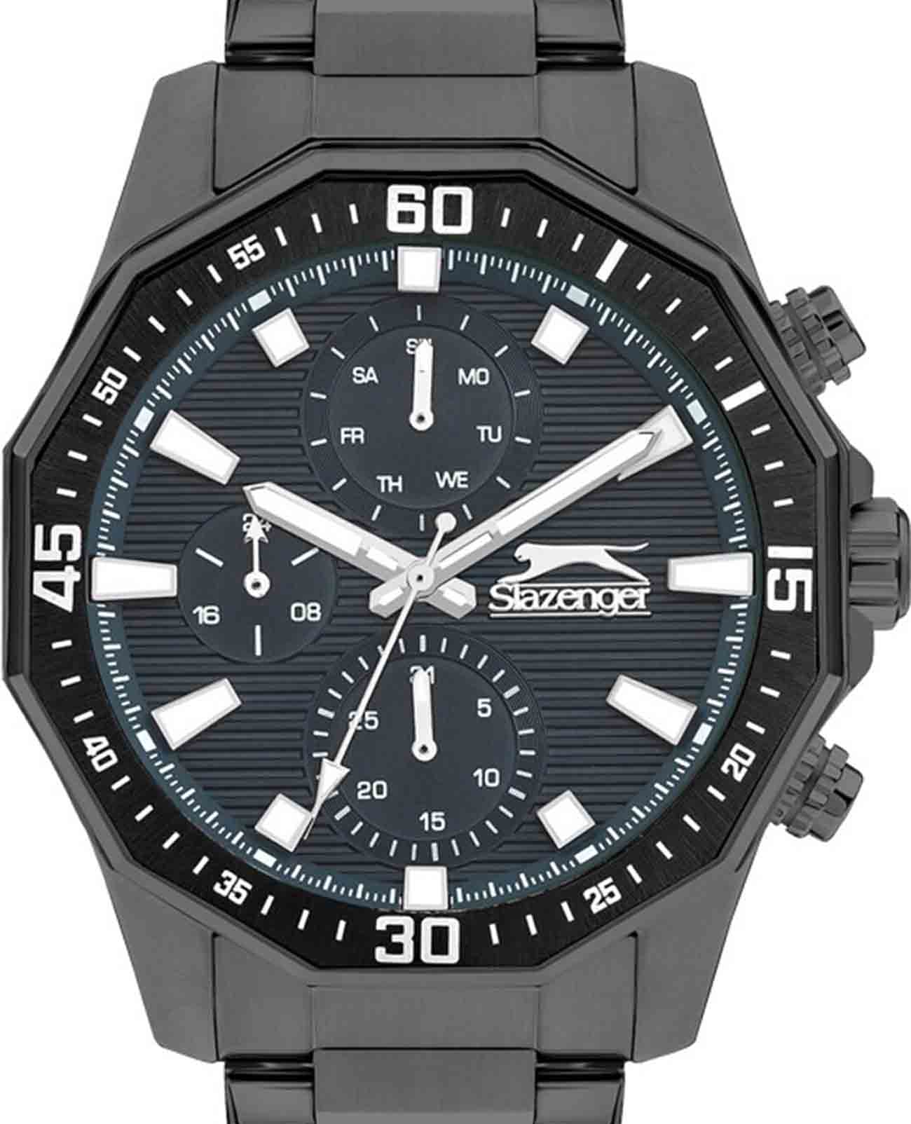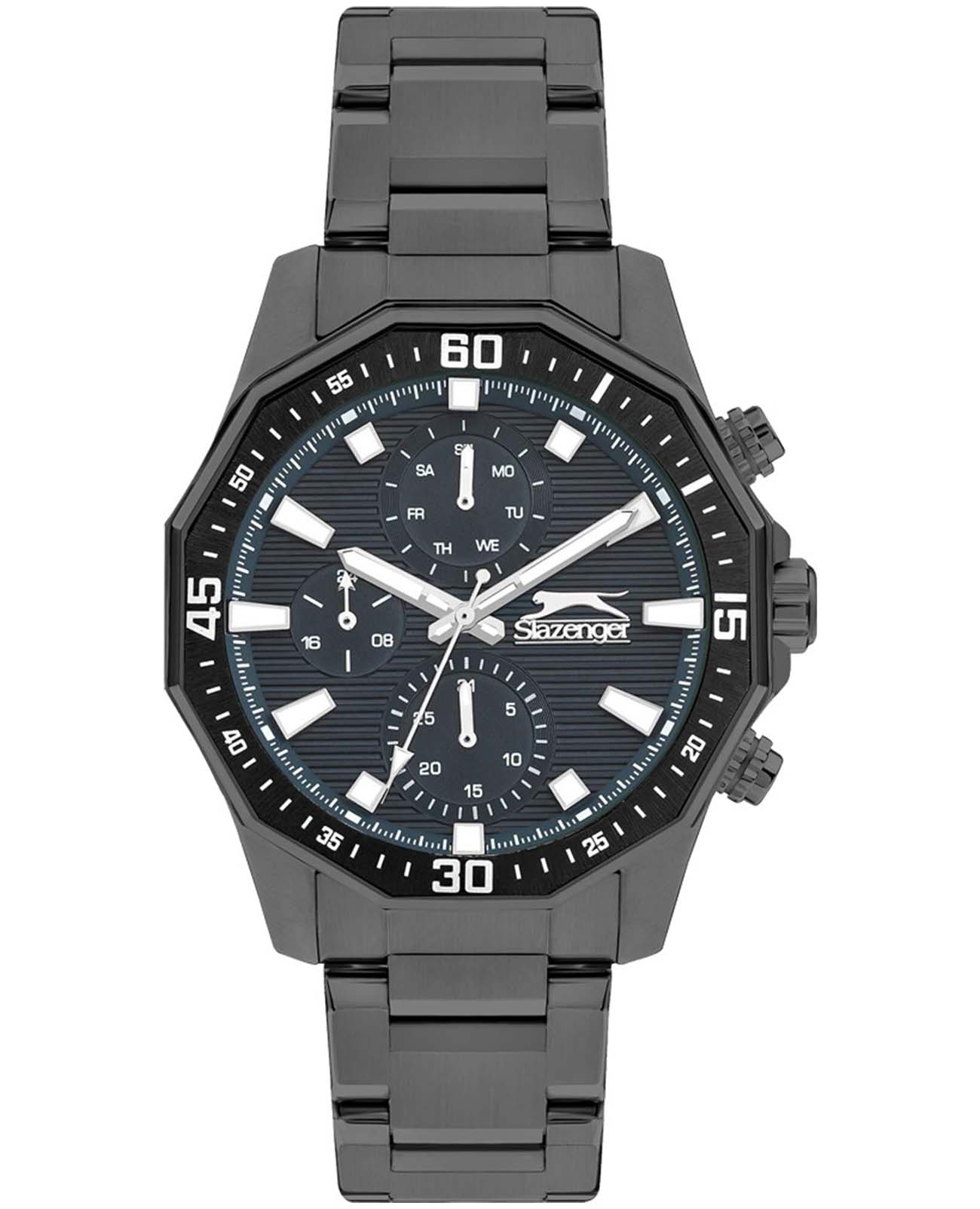 Стильные наручные часы Slazenger SL.09.2297.2.04 созданы для ценителей надежности и современного дизайна. Классический металлический с черным IP-покрытиемIP-покрытиеМетод ионного напыления. Демонстрирует повышенную устойчивость к истиранию, окислению и химическим веществам. Под воздействием высокого давления и температуры около 1500°C молекулы металла надёжно соединяются с частицами корпуса часов. корпус и браслет гармонично сочетают элегантность и практичность. Кварцевый механизм обеспечивает точность хода, а минеральное стеклоМинеральное стеклоМинеральное стекло представляет собой искусственно выращенный минерал кварца. Такое стекло отличается особой устойчивостью к повреждениям и царапинам. Уступает по некоторым качествам сапфировому стеклу. защищает циферблат от царапин. Особое внимание привлекает безельБезельВнешний ободок, закрепляющий стекло. В спортивных часах так называется поворотное кольцо с делениями на циферблате, выполняет роль таймера – замеряет отрезки времени на шкале. Неподвижный безель – элемент декора. Однонаправленно вращающийся безель на дайверских часах позволяет фиксировать моменты погружения и выныривания на поверхность. с черным IP-покрытиемIP-покрытиеМетод ионного напыления. Демонстрирует повышенную устойчивость к истиранию, окислению и химическим веществам. Под воздействием высокого давления и температуры около 1500°C молекулы металла надёжно соединяются с частицами корпуса часов.. На дополнительных малых циферблатах отображаются день недели, число и текущее время в 24-часовом формате. Модель оснащена люминесцентным покрытиемЛюминесцентное покрытиеПозволяет считывать показания времени в темноте. Производители наносят на стрелки, часовые индексы, безель или поверхность циферблата светонакопительный состав, дающий холодное свечение. стрелок и меток, что облегчает считывание времени в темноте. Водозащита 50 метров позволяет не снимать часы во время дождя или мытья рук. Заводная головка оснащена защитой, а задняя крышка завинчивается для дополнительной безопасности. Браслет снабжен удобной раскладной застёжкойРаскладная застёжкаТакой тип застёжки используется только на браслетах из металла. Она никогда не раскрывается полностью, происходит разделение на 2 и более частей. Раскладывающая застёжка снизит вероятность потери часов к минимуму.. Диаметр корпуса составляет 43 мм, толщина — 13 мм, ширина ремешка 22 мм, а вес часов — 167 грамм.