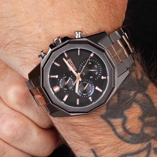 Мужские кварцевые часы Slazenger SL.09.2312.2.02 — это выразительный и функциональный аксессуар, сочетающий прочность, стиль и насыщенную комплектацию. Браслет выполнены из суперметалла с IP-покрытиемIP-покрытиеМетод ионного напыления. Демонстрирует повышенную устойчивость к истиранию, окислению и химическим веществам. Под воздействием высокого давления и температуры около 1500°C молекулы металла надёжно соединяются с частицами корпуса часов., корпус из суперметалла оснащён минеральным стекломМинеральное стеклоМинеральное стекло представляет собой искусственно выращенный минерал кварца. Такое стекло отличается особой устойчивостью к повреждениям и царапинам. Уступает по некоторым качествам сапфировому стеклу.. Циферблат чёрного цвета оформлен с вынесенными малыми циферблатами для индикации дня недели, даты и времени в 24-часовом формате. Стрелки и метки оснащены люминесцентным покрытиемЛюминесцентное покрытиеПозволяет считывать показания времени в темноте. Производители наносят на стрелки, часовые индексы, безель или поверхность циферблата светонакопительный состав, дающий холодное свечение., обеспечивающим хорошую читаемость в темноте. Заводная головка снабжена защитой, а задняя крышка — завинчивающаяся, что повышает надёжность конструкции. Браслет комбинированного цвета фиксируется на раскладной застёжкеРаскладная застёжкаТакой тип застёжки используется только на браслетах из металла. Она никогда не раскрывается полностью, происходит разделение на 2 и более частей. Раскладывающая застёжка снизит вероятность потери часов к минимуму., обеспечивая удобство и безопасность ношения. Водонепроницаемость 50 м позволяет использовать часы в повседневных условиях, защищая от случайных брызг и капель дождя. Модель подчёркивает индивидуальность владельца и идеально подходит как для повседневного, так и для делового образа.