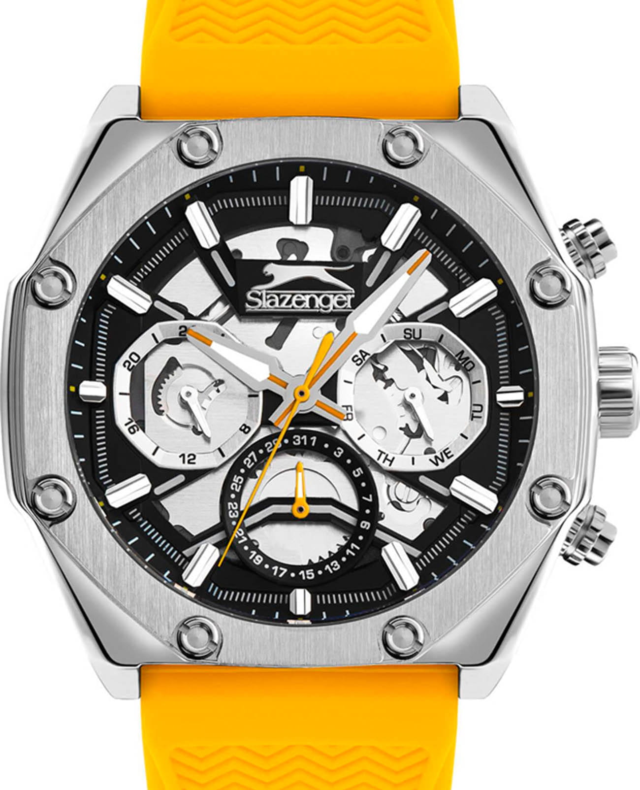 Мужские кварцевые часы Slazenger SL.09.2319.2.06 - это выразительный и функциональный аксессуар, сочетающий стиль, технологичность и насыщенную комплектацию. Корпус выполнен из суперметалла. Циферблат защищён минеральным стекломМинеральное стеклоМинеральное стекло представляет собой искусственно выращенный минерал кварца. Такое стекло отличается особой устойчивостью к повреждениям и царапинам. Уступает по некоторым качествам сапфировому стеклу., частично скелетонизирован, что позволяет наблюдать за работой механизма. Часы оснащены вынесенными малыми циферблатами для индикации дня недели, даты и времени в 24-часовом формате. Стрелки и метки оснащены люминесцентным покрытиемЛюминесцентное покрытиеПозволяет считывать показания времени в темноте. Производители наносят на стрелки, часовые индексы, безель или поверхность циферблата светонакопительный состав, дающий холодное свечение., обеспечивающим хорошую читаемость в темноте. Удобный силиконовый ремешок жёлтого цвета фиксируется на классической пряжке. Водонепроницаемость 50 м позволяет использовать часы в повседневных условиях, защищая от случайных брызг и капель дождя. Модель подчёркивает индивидуальность владельца и идеально подходит как для повседневного, так и для спортивного образа.