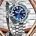 Мужские наручные часы Stuhrling Original 1005.01 из коллекции Aquadiver сочетают в себе надежность и стильный дизайн, идеально подходящий для активного образа жизни. Модель обладает круглым корпусом диаметром 45 мм, изготовленным из нержавеющей стали, что обеспечивает повышенную устойчивость к внешним воздействиям]. БезельБезельВнешний ободок, закрепляющий стекло. В спортивных часах так называется поворотное кольцо с делениями на циферблате, выполняет роль таймера – замеряет отрезки времени на шкале. Неподвижный безель – элемент декора. Однонаправленно вращающийся безель на дайверских часах позволяет фиксировать моменты погружения и выныривания на поверхность. с PVD-покрытиемPVDУльтратонкое покрытие наносится в технике вакуумного напыления, сочетает в себе нитрид титана особой прочности со слоем золота или оксида хрома. Несёт в себе декоративную или защитную функцию.. Браслет выполнен из прочной стали с раскладной застежкойРаскладная застёжкаТакой тип застёжки используется только на браслетах из металла. Она никогда не раскрывается полностью, происходит разделение на 2 и более частей. Раскладывающая застёжка снизит вероятность потери часов к минимуму., гарантирующей комфортное ношение и безопасность. Синий циферблат оснащен люминесцентным покрытиемЛюминесцентное покрытиеПозволяет считывать показания времени в темноте. Производители наносят на стрелки, часовые индексы, безель или поверхность циферблата светонакопительный состав, дающий холодное свечение. стрелок и маркеров, обеспечивающим высокую читаемость даже в условиях плохой видимости под водой]. Для защиты используется стекло KrysternaKrysternaKrysterna — инновационное стекло для наручных часов. Благодаря уникальной структуре, Krysterna объединяет ключевые преимущества двух материалов: твердость сапфира, защищающую от царапин, и гибкость минерального стекла, обеспечивающую устойчивость к деформациям. Такая комбинация делает его идеальным решением для часов, подверженных экстремальным нагрузкам, сохраняя при этом оптическую прозрачность., которое делает его устойчивым к царапинам и бликам]. Часы работают на механическом механизме с автоподзаводом, что гарантирует точное время без необходимости ручного завода]. Модель предлагает множество функций: секундомерСекундомерСекундоме́р — прибор, способный измерять интервалы времени с точностью до долей секунды., таймерТаймерОтсчитывает секунды в обратном направлении в заданном интервале времени. и водонепроницаемость до 200WR, что позволяет использовать их во время плавания и других водных видов спорта, включая дайвинг]. Ударопрочный корпус и эргономичный дизайн делают эти часы идеальным выбором для любителей активного отдыха и профессионалов].