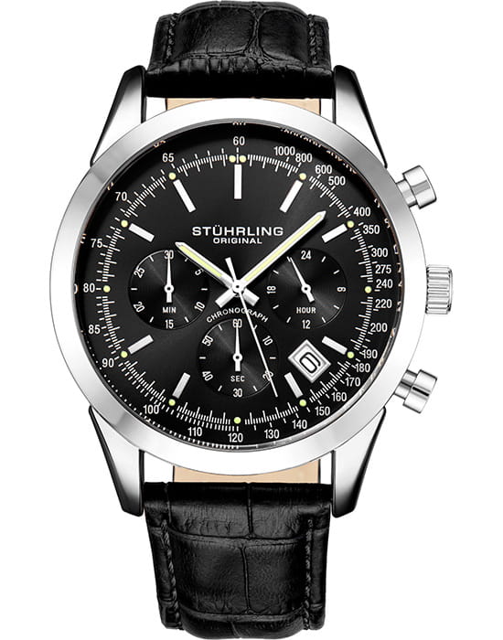 Stuhrling 3975L.1 — стильные мужские часы с выразительным пилотским дизайном и мощным функционалом. Классический циферблат дополнен контрастными счётчиками хронографаХронографФункция позволяет измерять отрезки времени с особой точностью: часы, минуты, секунды. Верным признаком хронографа является наличие на циферблате 3 дополнительных окошек-счётчиков., тахиметрической шкалой по ободу и аккуратным окошком даты, подчёркивающими технический характер модели. Корпус из нержавеющей стали придаёт часам надёжность и современный блеск, а стекло KrysternaKrysternaKrysterna — инновационное стекло для наручных часов. Благодаря уникальной структуре, Krysterna объединяет ключевые преимущества двух материалов: твердость сапфира, защищающую от царапин, и гибкость минерального стекла, обеспечивающую устойчивость к деформациям. Такая комбинация делает его идеальным решением для часов, подверженных экстремальным нагрузкам, сохраняя при этом оптическую прозрачность. защищает поверхность от царапин и сохраняет кристальную прозрачность. Кожаный ремень с классической текстурой аллигатора и стандартной застежкой, обеспечивает комфорт и элегантную посадку на запястье. Stuhrling — гармония силы, точности и изысканного стиля для мужчин, ценящих уверенность и безупречный вкус.