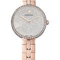 Swarovski 5517803 из коллекции Cosmopolitan — элегантные женские часы, сочетающие современный дизайн и высокое качество. Корпус диаметром 32 мм выполнен из нержавеющей стали с розовым PVD-покрытиемPVDУльтратонкое покрытие наносится в технике вакуумного напыления, сочетает в себе нитрид титана особой прочности со слоем золота или оксида хрома. Несёт в себе декоративную или защитную функцию., что придаёт часам долговечность и утончённый внешний вид. БезельБезельВнешний ободок, закрепляющий стекло. В спортивных часах так называется поворотное кольцо с делениями на циферблате, выполняет роль таймера – замеряет отрезки времени на шкале. Неподвижный безель – элемент декора. Однонаправленно вращающийся безель на дайверских часах позволяет фиксировать моменты погружения и выныривания на поверхность. украшен кристаллами Swarovski, создающими изысканный блеск. Минеральное стеклоМинеральное стеклоМинеральное стекло представляет собой искусственно выращенный минерал кварца. Такое стекло отличается особой устойчивостью к повреждениям и царапинам. Уступает по некоторым качествам сапфировому стеклу. защищает циферблат от царапин и повреждений. Циферблат серебристого цвета с изящными розово-золотистыми метками и стрелками подчёркивает элегантность дизайна. Логотип Swarovski в виде лебедя расположен на отметке «12 часов». Часы оснащены швейцарским кварцевым механизмом, обеспечивающим точный и надёжный ход. Водозащита до 5 ATM (50 метров) позволяет использовать часы в повседневной жизни, включая лёгкие контакты с водой. Браслет из нержавеющей стали с розовым PVD-покрытиемPVDУльтратонкое покрытие наносится в технике вакуумного напыления, сочетает в себе нитрид титана особой прочности со слоем золота или оксида хрома. Несёт в себе декоративную или защитную функцию. гарантирует комфортное ношение. Застёжка-бабочка с кнопкамиЗастёжка "бабочка"Такой вид застёжки дополняется предохранителями, помогающими избежать случайного раскрытия браслета. Обладают изящным исполнением. обеспечивает надёжную фиксацию на запястье. Swarovski 5517803 — это идеальный выбор для женщин, которые ценят стиль, утончённость и функциональность.