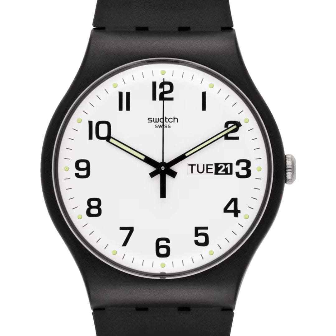 Часы Swatch SO29B703 — стильный и надежный аксессуар. Современный взгляд на классику. Эти часы имеют белый циферблат с черными цифрами и стрелками. Стрелки и индексы светятся в темноте, так как имеют люминесцентное покрытиеЛюминесцентное покрытиеПозволяет считывать показания времени в темноте. Производители наносят на стрелки, часовые индексы, безель или поверхность циферблата светонакопительный состав, дающий холодное свечение.. Корпус и стекло из биоматериала. Есть окошко даты и дней недели. Матовый черный ремешок из биоматериала с соответствующей петлей и пряжкой завершает их неповторимый вид. Внутри часов установлен надежный кварцевый механизм, который обеспечивает точность хода. Эти часы водонепроницаемы до 30 метров, что позволяет не беспокоиться о случайных брызгах или дождевых каплях. Swatch SO29B703 — это идеальный выбор для тех, кто ценит сочетание стиля, комфорта и функциональности в одном аксессуаре.