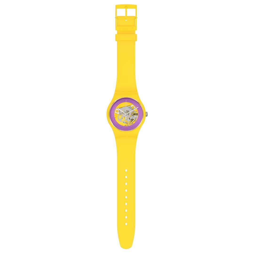 Часы Swatch SO29J100 — эффектный и надежный аксессуар. Желтый силиконовый ремешок и корпус этих часов NEW GENT BIOSOURCED контрастируют с циферблатом, который имеет стекло из биоматериала, фиолетовое кольцо и стрелки с люминесцентным покрытиемЛюминесцентное покрытиеПозволяет считывать показания времени в темноте. Производители наносят на стрелки, часовые индексы, безель или поверхность циферблата светонакопительный состав, дающий холодное свечение.. Циферблат прозрачный, позволяет наблюдать механизм часов. Ремешок на стандартной застёжке. Внутри часов установлен надежный кварцевый механизм, который обеспечивает точность хода. Эти часы водонепроницаемы до 30 метров, что позволяет не беспокоиться о случайных брызгах или дождевых каплях. Swatch SO29J100 — это идеальный выбор для тех, кто ценит сочетание стиля, комфорта и функциональности в одном аксессуаре.