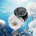 Мужские дайверские часы Swatch AURELIA AURITA SSCU09K100 — это стильный и современный аксессуар для тех, кто ценит лёгкость и комфорт. Корпус выполнен из биокерамики, который состоит из матовых и блестящих прозрачных частей из биоматериала, диаметром 44 мм и толщиной 15.4 мм, что обеспечивает долговечность и утончённый внешний вид. Циферблат защищён органическим стеклом, устойчивым к повреждениям. Модель оснащена кварцевым механизмом, обеспечивающим высокую точность хода. БезельБезельВнешний ободок, закрепляющий стекло. В спортивных часах так называется поворотное кольцо с делениями на циферблате, выполняет роль таймера – замеряет отрезки времени на шкале. Неподвижный безель – элемент декора. Однонаправленно вращающийся безель на дайверских часах позволяет фиксировать моменты погружения и выныривания на поверхность. из белого просвечивающего биоматериала с серо-белым принтом, светящимся в темноте, и белая матовая заводная головка из биокерамики, размещенная в районе отметки 10 часов. Стрелки и метки с люминесцентным покрытиемЛюминесцентное покрытиеПозволяет считывать показания времени в темноте. Производители наносят на стрелки, часовые индексы, безель или поверхность циферблата светонакопительный состав, дающий холодное свечение.. Силиконовый ремешок на стандартной застёжке гармонично дополняет корпус и обеспечивает комфортное ношение. Водозащита 100 метров позволит плавать, нырять и заниматься другими водными видами спорта. Эти часы подойдут для повседневного ношения и станут ярким акцентом в вашем наряде.