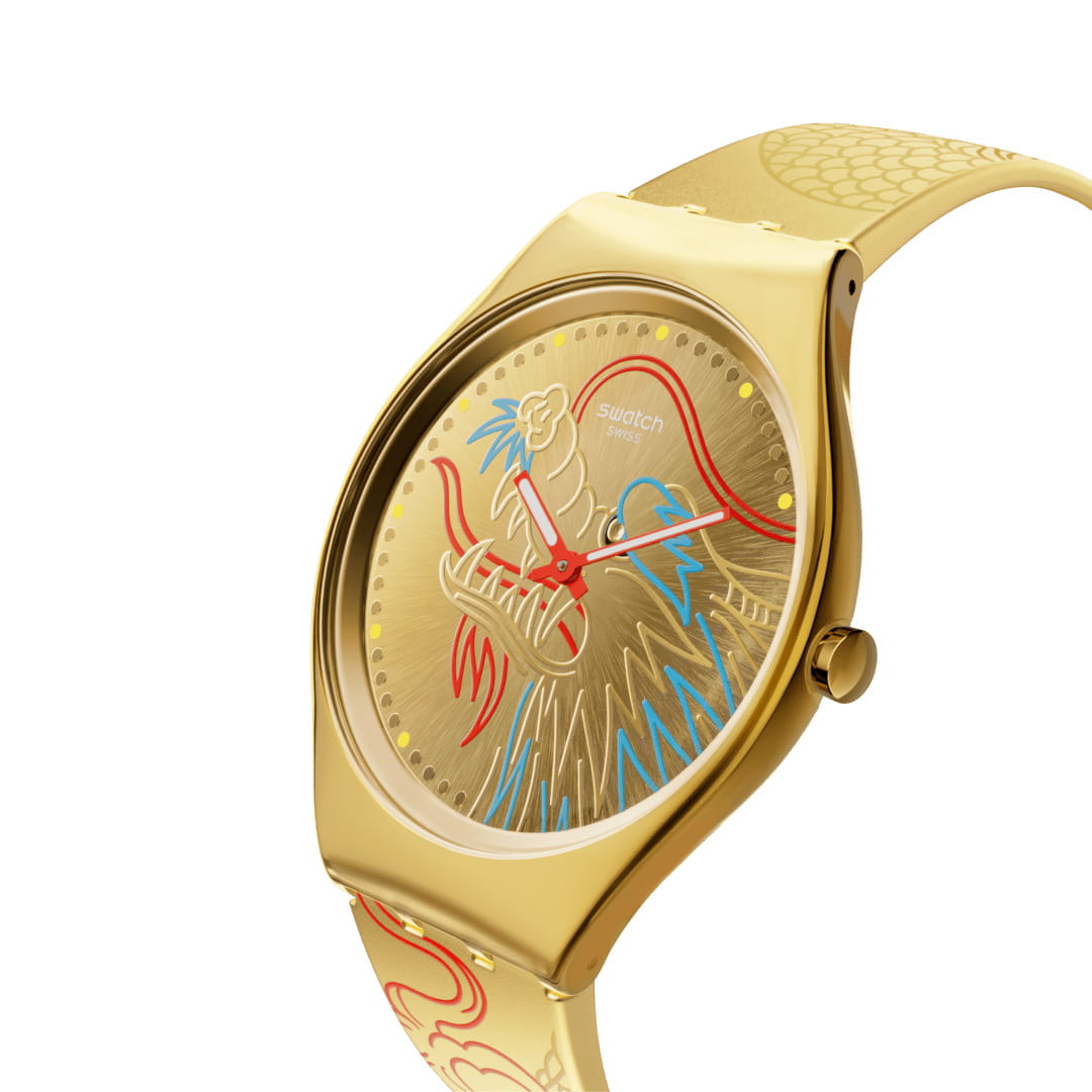 Часы Swatch SYXZ104 — это стильный и современный аксессуар для тех, кто ценит лёгкость и комфорт. Часы идеально подойдут как для мужчин, так и для женщин. Эти ультратонкие золотистые часы украшены разноцветным изображением дракона. Золотистый циферблат c PVDPVDУльтратонкое покрытие наносится в технике вакуумного напыления, сочетает в себе нитрид титана особой прочности со слоем золота или оксида хрома. Несёт в себе декоративную или защитную функцию. покрытием, с радиальной шлифовкой и принтом заключен в сияющий корпус и покрыт минеральным стекломМинеральное стеклоМинеральное стекло представляет собой искусственно выращенный минерал кварца. Такое стекло отличается особой устойчивостью к повреждениям и царапинам. Уступает по некоторым качествам сапфировому стеклу.. На золотистом ремешке с блестящей пряжкой в тон размещены два красных тренчика с надписями. На часовую, минутную стрелки розового цвета нанесено люминесцентное покрытиеЛюминесцентное покрытиеПозволяет считывать показания времени в темноте. Производители наносят на стрелки, часовые индексы, безель или поверхность циферблата светонакопительный состав, дающий холодное свечение., которое светится в темноте, создавая необычное изображение. Водозащита 30 метров делает часы практичными для повседневного использования. Эти часы подойдут для повседневного ношения и станут ярким акцентом в вашем наряде.