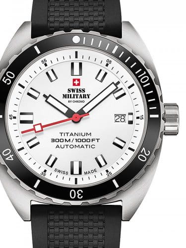 Мужские швейцарские механические часы с автоподзаводом Swiss Military by Chrono Titanium 300 SMA34100.08. Сапфировое стеклоСапфировое стеклоПрочный и надёжный материал из кристалла сапфира синтетического происхождения, характеризующийся особой твёрдостью и устойчивостью к царапинам и повреждениям. устойчивое к появлению царапин, обладающее высокой прозрачностью. Корпус часов изготовлен из титана. Вращающийся безельБезельВнешний ободок, закрепляющий стекло. В спортивных часах так называется поворотное кольцо с делениями на циферблате, выполняет роль таймера – замеряет отрезки времени на шкале. Неподвижный безель – элемент декора. Однонаправленно вращающийся безель на дайверских часах позволяет фиксировать моменты погружения и выныривания на поверхность. из высокотехнологичной керамикиВысокотехнологичная керамикаИнновационный запатентованный Rado материал с гладкой или матовой поверхностью. Керамика за счёт кристаллической структуры обладает повышенной устойчивостью от возникновения царапин. Материал способен принимать температуру тела человека, обеспечивая невероятный комфорт при ношении.. Индикация даты на позиции трех часов. Стрелки и метки с люминесцентной подсветкойЛюминесцентное покрытиеПозволяет считывать показания времени в темноте. Производители наносят на стрелки, часовые индексы, безель или поверхность циферблата светонакопительный состав, дающий холодное свечение.. Класс водозащиты: 300 метров, позволит плавать, нырять и заниматься другими водными видами спорта. Силиконовый браслет на раскладной застёжкеРаскладная застёжкаТакой тип застёжки используется только на браслетах из металла. Она никогда не раскрывается полностью, происходит разделение на 2 и более частей. Раскладывающая застёжка снизит вероятность потери часов к минимуму..