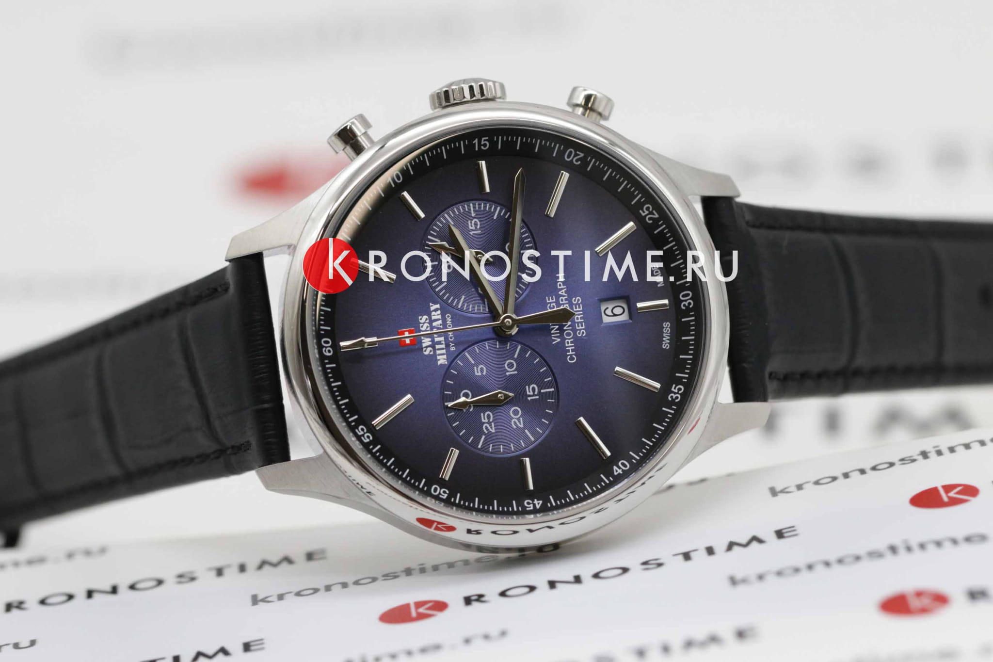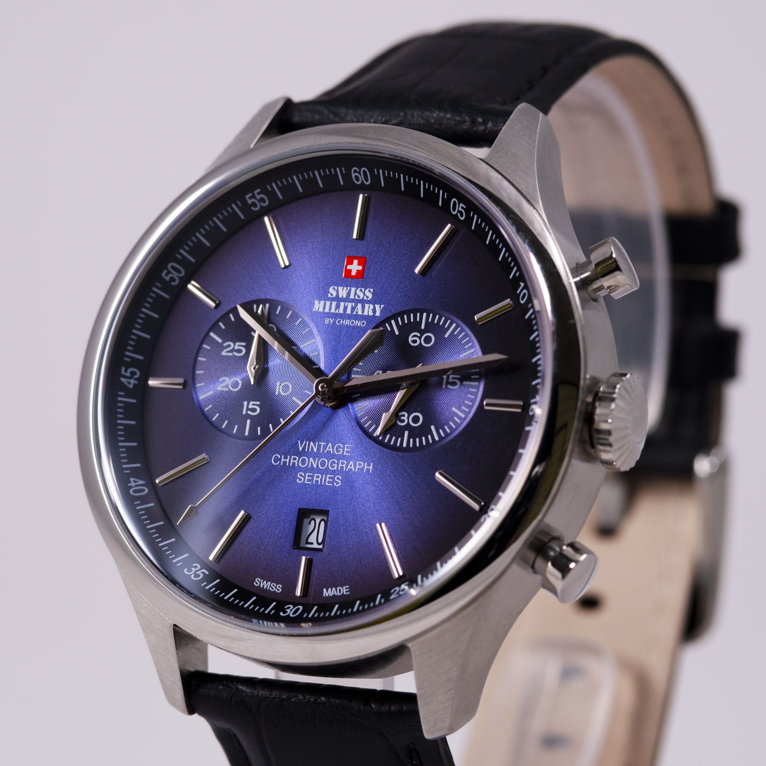 Мужские швейцарские наручные часы-хронографХронографФункция позволяет измерять отрезки времени с особой точностью: часы, минуты, секунды. Верным признаком хронографа является наличие на циферблате 3 дополнительных окошек-счётчиков. Swiss Military by Chrono SM30192.08, кварцевый механизм с высокой точностью. Класс водозащиты: 100 метров, позволит плавать, нырять и заниматься другими водными видами спорта. Корпус часов изготовлен из стали серебристого цвета. Апертура даты в позиции 6 часов. Черный кожаный ремешок с классической пряжкой. Модель оснащена секундомеромСекундомерСекундоме́р — прибор, способный измерять интервалы времени с точностью до долей секунды.. Стрелки и метки с люминесцентной подсветкойЛюминесцентное покрытиеПозволяет считывать показания времени в темноте. Производители наносят на стрелки, часовые индексы, безель или поверхность циферблата светонакопительный состав, дающий холодное свечение..