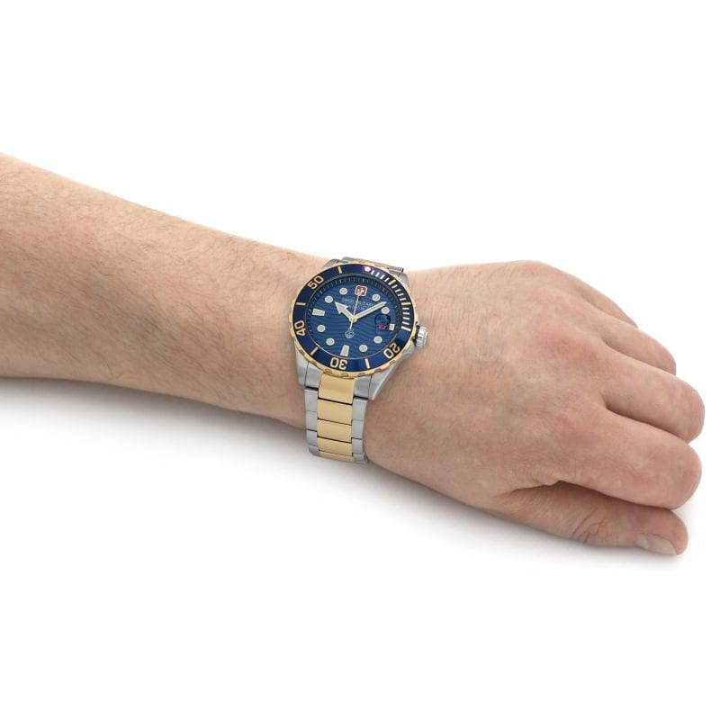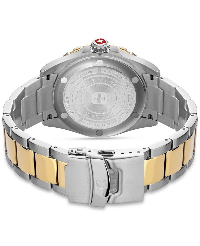 Швейцарские мужские дайверские часы Swiss Military Hanowa Offshore Diver II SMWGH2200360, кварцевый механизм с высокой точностью. Сапфировое стеклоСапфировое стеклоПрочный и надёжный материал из кристалла сапфира синтетического происхождения, характеризующийся особой твёрдостью и устойчивостью к царапинам и повреждениям. устойчивое к появлению царапин, обладающее высокой прозрачностью. Класс водозащиты: 200 метров, позволит плавать, нырять и заниматься другими водными видами спорта. Корпус часов изготовлен из стали. Рифленая заводная головка с защитой. Стальной браслет на раскладной застёжкеРаскладная застёжкаТакой тип застёжки используется только на браслетах из металла. Она никогда не раскрывается полностью, происходит разделение на 2 и более частей. Раскладывающая застёжка снизит вероятность потери часов к минимуму. с частичным с IP-покрытиемIP-покрытиеМетод ионного напыления. Демонстрирует повышенную устойчивость к истиранию, окислению и химическим веществам. Под воздействием высокого давления и температуры около 1500°C молекулы металла надёжно соединяются с частицами корпуса часов.. БезельБезельВнешний ободок, закрепляющий стекло. В спортивных часах так называется поворотное кольцо с делениями на циферблате, выполняет роль таймера – замеряет отрезки времени на шкале. Неподвижный безель – элемент декора. Однонаправленно вращающийся безель на дайверских часах позволяет фиксировать моменты погружения и выныривания на поверхность. с IP-покрытиемIP-покрытиеМетод ионного напыления. Демонстрирует повышенную устойчивость к истиранию, окислению и химическим веществам. Под воздействием высокого давления и температуры около 1500°C молекулы металла надёжно соединяются с частицами корпуса часов.. Стилизованный циферблат. Метки в виде штрихов и точек с люминесцентным покрытиемЛюминесцентное покрытиеПозволяет считывать показания времени в темноте. Производители наносят на стрелки, часовые индексы, безель или поверхность циферблата светонакопительный состав, дающий холодное свечение.. Окошко даты с увеличительным стеклом.