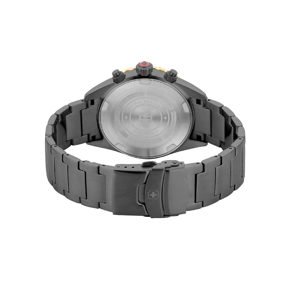 Мужские швейцарские часы c хронографомХронографФункция позволяет измерять отрезки времени с особой точностью: часы, минуты, секунды. Верным признаком хронографа является наличие на циферблате 3 дополнительных окошек-счётчиков. Swiss Military Hanowa SMWGI0000341, кварцевый механизм с высокой точностью. Сапфировое стеклоСапфировое стеклоПрочный и надёжный материал из кристалла сапфира синтетического происхождения, характеризующийся особой твёрдостью и устойчивостью к царапинам и повреждениям. устойчивое к появлению царапин, обладающее высокой прозрачностью. Класс водозащиты: 100 метров, позволит плавать, нырять и заниматься другими водными видами спорта. Корпус и браслет часов изготовлены из стали с IP-покрытиемIP-покрытиеМетод ионного напыления. Демонстрирует повышенную устойчивость к истиранию, окислению и химическим веществам. Под воздействием высокого давления и температуры около 1500°C молекулы металла надёжно соединяются с частицами корпуса часов.. Индикация даты. ТахиметрТахиметрРазмеченная шкала, располагается на ободке или безеле часов. Тахиметр позволяет рассчитать скорость на определённом участке пути, расстояние измеряется в километрах или милях.. Черный циферблат с часовыми индексами в виде штрихов. Стрелки и метки с люминесцентным покрытиемЛюминесцентное покрытиеПозволяет считывать показания времени в темноте. Производители наносят на стрелки, часовые индексы, безель или поверхность циферблата светонакопительный состав, дающий холодное свечение..