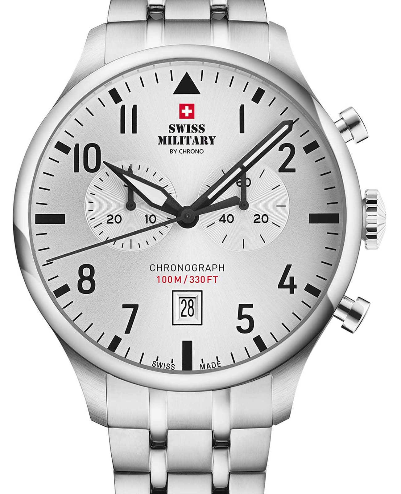 Мужские швейцарские часы-хронографХронографФункция позволяет измерять отрезки времени с особой точностью: часы, минуты, секунды. Верным признаком хронографа является наличие на циферблате 3 дополнительных окошек-счётчиков. с секундомеромСекундомерСекундоме́р — прибор, способный измерять интервалы времени с точностью до долей секунды. Swiss Military by Chrono Vintage Chronograph SM34098.02, кварцевый механизм с высокой точностью. Сапфировое стеклоСапфировое стеклоПрочный и надёжный материал из кристалла сапфира синтетического происхождения, характеризующийся особой твёрдостью и устойчивостью к царапинам и повреждениям. устойчивое к мелким механическим повреждениям. Корпус часов изготовлен из нержавеющей стали. На циферблате расположены два дополнительных индикатора и окошко даты. Окошко даты находится в положении 6 часов. Стрелки с люминесцентным покрытиемЛюминесцентное покрытиеПозволяет считывать показания времени в темноте. Производители наносят на стрелки, часовые индексы, безель или поверхность циферблата светонакопительный состав, дающий холодное свечение.. Класс водозащиты: 100 метров, позволит плавать, нырять и заниматься другими водными видами спорта. Стальной браслет на раскладной застёжкеРаскладная застёжкаТакой тип застёжки используется только на браслетах из металла. Она никогда не раскрывается полностью, происходит разделение на 2 и более частей. Раскладывающая застёжка снизит вероятность потери часов к минимуму..