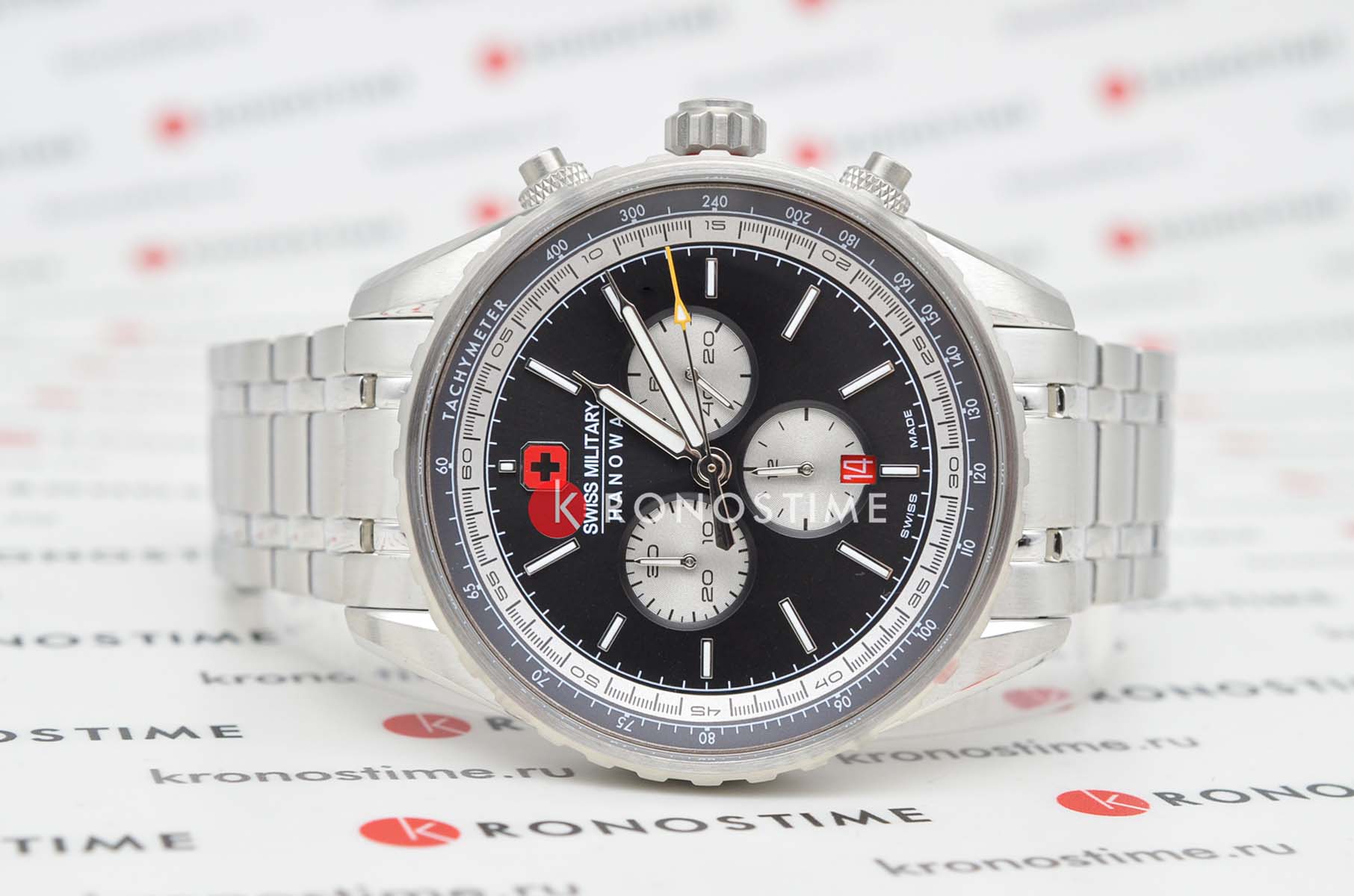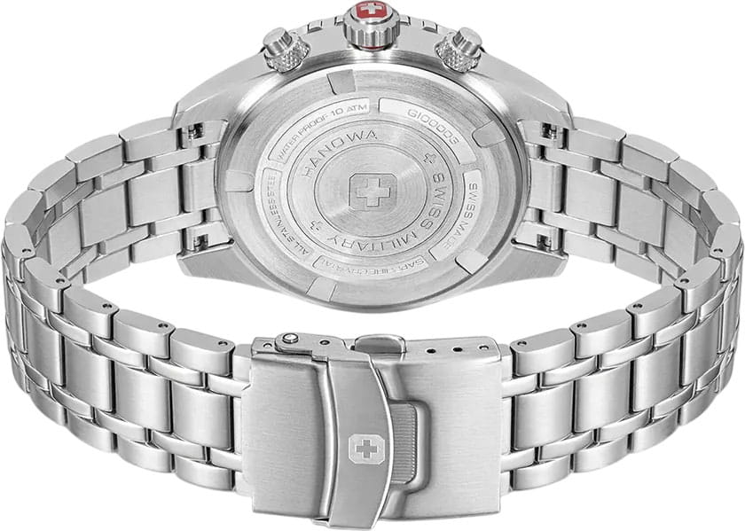 Мужские швейцарские часы Swiss Military Hanowa Afterburn Chrono SMWGI0000309 с хронографомХронографФункция позволяет измерять отрезки времени с особой точностью: часы, минуты, секунды. Верным признаком хронографа является наличие на циферблате 3 дополнительных окошек-счётчиков. и секундомеромСекундомерСекундоме́р — прибор, способный измерять интервалы времени с точностью до долей секунды.. Сапфировое стеклоСапфировое стеклоПрочный и надёжный материал из кристалла сапфира синтетического происхождения, характеризующийся особой твёрдостью и устойчивостью к царапинам и повреждениям. с антибликовым покрытием защищает циферблат от царапин и обеспечивает отличную читаемость при любом освещении. Корпус из нержавеющей стали диаметром 44 мм сбалансирован и элегантен. Браслет с раскладной застёжкойРаскладная застёжкаТакой тип застёжки используется только на браслетах из металла. Она никогда не раскрывается полностью, происходит разделение на 2 и более частей. Раскладывающая застёжка снизит вероятность потери часов к минимуму. идеально дополняют дизайн часов, обеспечивая комфортное ношение. Люминесцентное покрытиеЛюминесцентное покрытиеПозволяет считывать показания времени в темноте. Производители наносят на стрелки, часовые индексы, безель или поверхность циферблата светонакопительный состав, дающий холодное свечение. стрелок и меток позволит вам следить за временем даже в полной темноте. Стальной безельБезельВнешний ободок, закрепляющий стекло. В спортивных часах так называется поворотное кольцо с делениями на циферблате, выполняет роль таймера – замеряет отрезки времени на шкале. Неподвижный безель – элемент декора. Однонаправленно вращающийся безель на дайверских часах позволяет фиксировать моменты погружения и выныривания на поверхность. с PVD-покрытиемPVDУльтратонкое покрытие наносится в технике вакуумного напыления, сочетает в себе нитрид титана особой прочности со слоем золота или оксида хрома. Несёт в себе декоративную или защитную функцию.. Часы оснащены центральной секундной стрелкой и окошком даты в положении «6 часов», что делает их функциональными для повседневного использования. ТахиметрТахиметрРазмеченная шкала, располагается на ободке или безеле часов. Тахиметр позволяет рассчитать скорость на определённом участке пути, расстояние измеряется в километрах или милях. по внешнему краю. Водонепроницаемость до 100 метров. Идеальный выбор для тех, кто ценит качество и долговечность.