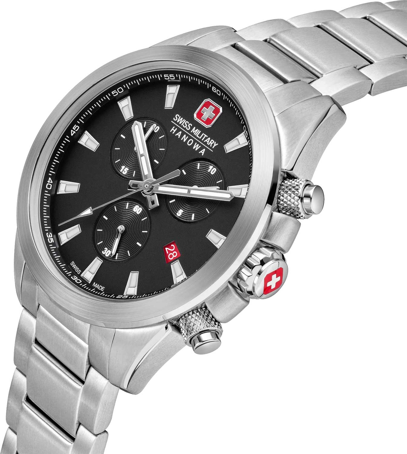 Мужские швейцарские часы-хронографХронографФункция позволяет измерять отрезки времени с особой точностью: часы, минуты, секунды. Верным признаком хронографа является наличие на циферблате 3 дополнительных окошек-счётчиков. Swiss Military Hanowa Chiroptera SMWGI0001901, кварцевый механизм с высокой точностью. Сапфировое стеклоСапфировое стеклоПрочный и надёжный материал из кристалла сапфира синтетического происхождения, характеризующийся особой твёрдостью и устойчивостью к царапинам и повреждениям. устойчивое к появлению царапин, обладающее высокой прозрачностью. Секундная стрелка вынесена на малый циферблат. Стрелки с люминесцентным покрытиемЛюминесцентное покрытиеПозволяет считывать показания времени в темноте. Производители наносят на стрелки, часовые индексы, безель или поверхность циферблата светонакопительный состав, дающий холодное свечение.. Окошко даты находится в положении 4 часов. Класс водозащиты: 100 метров, позволит плавать, нырять и заниматься другими водными видами спорта. Стальной браслет на раскладной застёжкеРаскладная застёжкаТакой тип застёжки используется только на браслетах из металла. Она никогда не раскрывается полностью, происходит разделение на 2 и более частей. Раскладывающая застёжка снизит вероятность потери часов к минимуму..