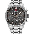 Мужские швейцарские часы-хронографХронографФункция позволяет измерять отрезки времени с особой точностью: часы, минуты, секунды. Верным признаком хронографа является наличие на циферблате 3 дополнительных окошек-счётчиков. Swiss Military Hanowa SMWGI0003103, кварцевый механизм с высокой точностью. Сапфировое стеклоСапфировое стеклоПрочный и надёжный материал из кристалла сапфира синтетического происхождения, характеризующийся особой твёрдостью и устойчивостью к царапинам и повреждениям. устойчивое к появлению царапин, обладающее высокой прозрачностью. Окошко даты находится в положении между 4 и 5 часами. Класс водозащиты: 100 метров, позволит плавать, нырять и заниматься другими водными видами спорта. Корпус часов изготовлен из стали. Стальной браслет на раскладной застёжкеРаскладная застёжкаТакой тип застёжки используется только на браслетах из металла. Она никогда не раскрывается полностью, происходит разделение на 2 и более частей. Раскладывающая застёжка снизит вероятность потери часов к минимуму.. Стрелки и метки с люминесцентным покрытиемЛюминесцентное покрытиеПозволяет считывать показания времени в темноте. Производители наносят на стрелки, часовые индексы, безель или поверхность циферблата светонакопительный состав, дающий холодное свечение..