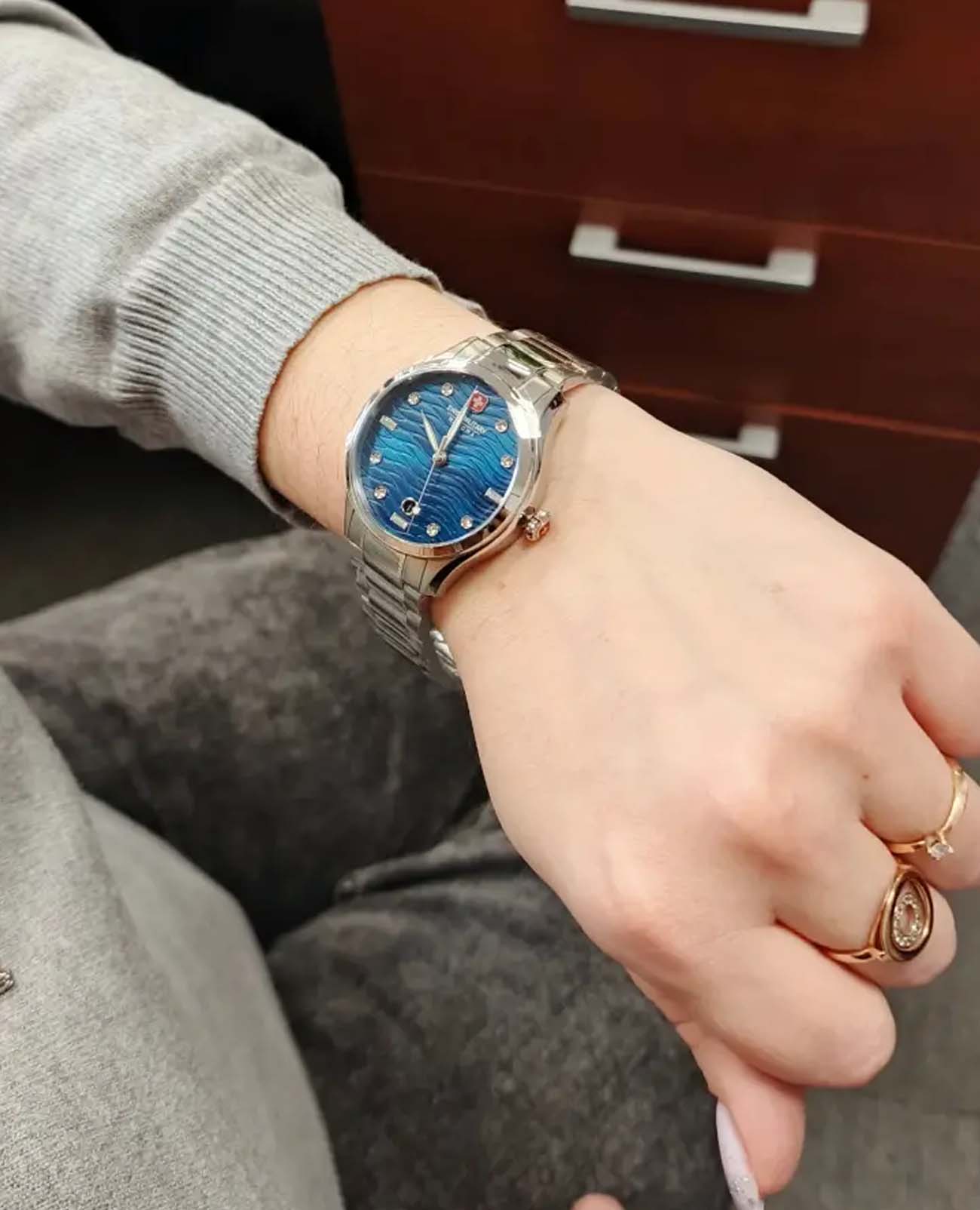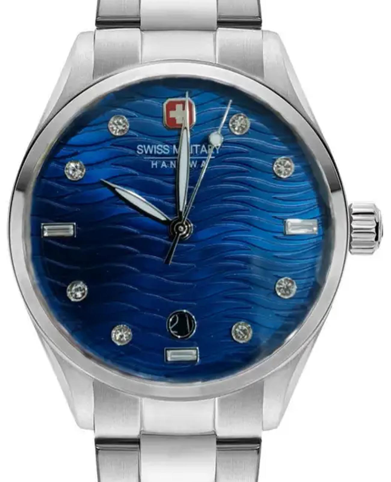 Женские швейцарские часы Swiss Military Hanowa Manta Lady SMWLH0005302, кварцевый механизм с высокой точностью. Сапфировое стеклоСапфировое стеклоПрочный и надёжный материал из кристалла сапфира синтетического происхождения, характеризующийся особой твёрдостью и устойчивостью к царапинам и повреждениям. устойчивое к появлению царапин, обладающее высокой прозрачностью. Класс водозащиты: 50 метров, позволит защитить корпус от случайных брызг или капель дождя. Корпус часов изготовлен из стали. Стальной браслет на раскладной застёжкеРаскладная застёжкаТакой тип застёжки используется только на браслетах из металла. Она никогда не раскрывается полностью, происходит разделение на 2 и более частей. Раскладывающая застёжка снизит вероятность потери часов к минимуму.. Окошко даты находится в положении 6 часов.