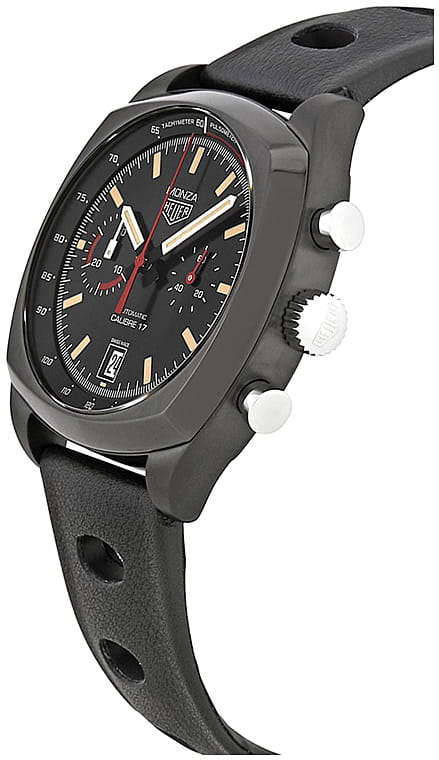 Специальная серия часов TAG Heuer Heritage Calibre 17 Monza Edition – это лимитированный выпуск, сочетающий в себе винтажный дизайн и современные технологии. Корпус из легкого и прочного титана диаметром 42 мм имеет необычную форму квадрата с выпуклыми скругленными сторонами. Ремень из черной кожи дополнен широкими круглыми отверстиями, застежка выполнена из титанового сплава.