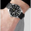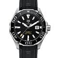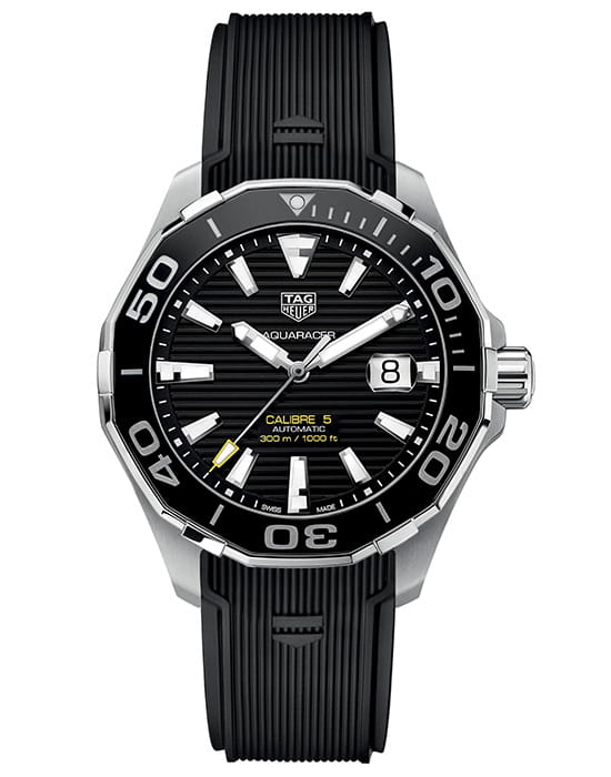 TAG Heuer Aquaracer WAY201A.FT6142 — это стильные и надежные часы для активного образа жизни. Корпус диаметром 43 мм выполнен из нержавеющей стали и дополнен безелемБезельВнешний ободок, закрепляющий стекло. В спортивных часах так называется поворотное кольцо с делениями на циферблате, выполняет роль таймера – замеряет отрезки времени на шкале. Неподвижный безель – элемент декора. Однонаправленно вращающийся безель на дайверских часах позволяет фиксировать моменты погружения и выныривания на поверхность. с черной керамической вставкой, обеспечивающей защиту от царапин. Четкие метки и стрелки на черном циферблате покрыты люминесцентным покрытиемЛюминесцентное покрытиеПозволяет считывать показания времени в темноте. Производители наносят на стрелки, часовые индексы, безель или поверхность циферблата светонакопительный состав, дающий холодное свечение., что гарантирует превосходную читаемость в темноте. Циферблат защищает сапфировое стеклоСапфировое стеклоПрочный и надёжный материал из кристалла сапфира синтетического происхождения, характеризующийся особой твёрдостью и устойчивостью к царапинам и повреждениям. с антибликовым покрытиемАнтибликовое покрытиеСлой оксида металла в 0,13-0,3 микрон, благодаря которому стекло часов не бликует и не отражает свет. Антибликовое покрытие уменьшает отражение света в 10 раз, обеспечивая отличную читаемость показателей циферблата.. Внутри установлен автоматический механизм TAG Heuer Calibre 5, обеспечивающий надежную точность хода. Часы комплектуются прочным каучуковым ремешком, а раскладная застёжкаРаскладная застёжкаТакой тип застёжки используется только на браслетах из металла. Она никогда не раскрывается полностью, происходит разделение на 2 и более частей. Раскладывающая застёжка снизит вероятность потери часов к минимуму. с предохранительными кнопками гарантирует надежную фиксацию на запястье. Водонепроницаемость до 300 метров делает модель идеальной для плавания и дайвинга.