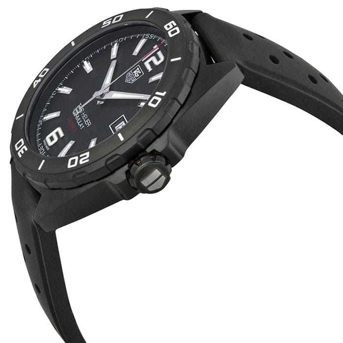 Круглый корпус выполнен из нержавеющей стали 316L с PVD-покрытиемPVDУльтратонкое покрытие наносится в технике вакуумного напыления, сочетает в себе нитрид титана особой прочности со слоем золота или оксида хрома. Несёт в себе декоративную или защитную функцию., что делает его устойчивым к царапинам и придает элегантный внешний вид. Вращающийся безель с PVD-покрытиемPVDУльтратонкое покрытие наносится в технике вакуумного напыления, сочетает в себе нитрид титана особой прочности со слоем золота или оксида хрома. Несёт в себе декоративную или защитную функцию. и гравированной разметкой добавляет функциональности для точного отсчета времени. Заводная коронка «Easy Grip» с винтовой фиксацией и красным акцентом обеспечивает удобство использования, а задняя крышка с гравировкой Formula 1 имеет резьбовое соединение с корпусом для дополнительной защиты механизма. Аппликации часовых индексов и стрелки с ювелирной огранкой и глянцевой полировкой имеют люминесцентное покрытиеЛюминесцентное покрытиеПозволяет считывать показания времени в темноте. Производители наносят на стрелки, часовые индексы, безель или поверхность циферблата светонакопительный состав, дающий холодное свечение., которое позволяет легко определять время даже в темноте. Окошко даты расположено в положении «3 часа», добавляя функциональности.
