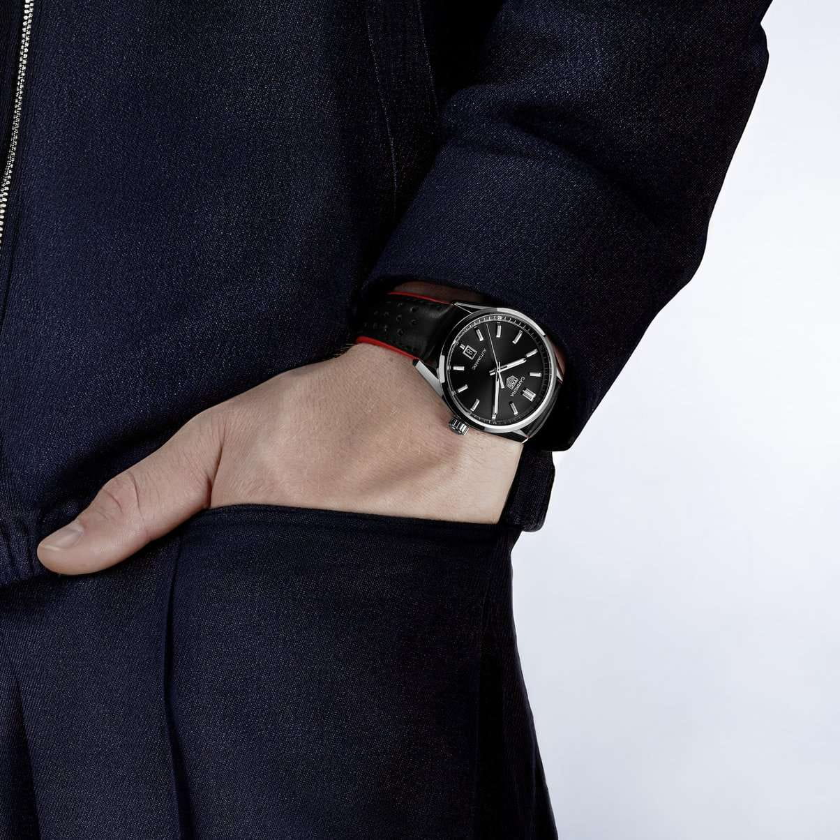 TAG Heuer Carrera Date WBN2110.FC6623 - сочетают в себе яркий характер и современный стиль. Чёрный циферблат с отделкой Azurage, автоматический механизм Calibre 5 обеспечивает стабильную работу. Корпус из полированной и сатинированной стали диаметром 39 мм предлагают отличную считываемость показаний – идеальный выбор для тех, кто ценит элегантность и функциональность. Сапфировое стеклоСапфировое стеклоПрочный и надёжный материал из кристалла сапфира синтетического происхождения, характеризующийся особой твёрдостью и устойчивостью к царапинам и повреждениям. с антибликовым покрытиемАнтибликовое покрытиеСлой оксида металла в 0,13-0,3 микрон, благодаря которому стекло часов не бликует и не отражает свет. Антибликовое покрытие уменьшает отражение света в 10 раз, обеспечивая отличную читаемость показателей циферблата. устойчивое к появлению царапин, обладающее высокой прозрачностью. Стрелки с люминесцентным покрытиемЛюминесцентное покрытиеПозволяет считывать показания времени в темноте. Производители наносят на стрелки, часовые индексы, безель или поверхность циферблата светонакопительный состав, дающий холодное свечение. Super-LumiNova® — для превосходной читаемости в любых условиях. Аккуратное окошко даты на отметке «6 часов» сохраняет гармоничные пропорции корпуса. Спортивный кожаный ремешок с раскладной застёжкойРаскладная застёжкаТакой тип застёжки используется только на браслетах из металла. Она никогда не раскрывается полностью, происходит разделение на 2 и более частей. Раскладывающая застёжка снизит вероятность потери часов к минимуму. и оранжевыми акцентами придают модели вневременную привлекательность. Класс водозащиты: 100 метров позволит плавать, нырять и заниматься другими водными видами спорта.