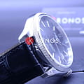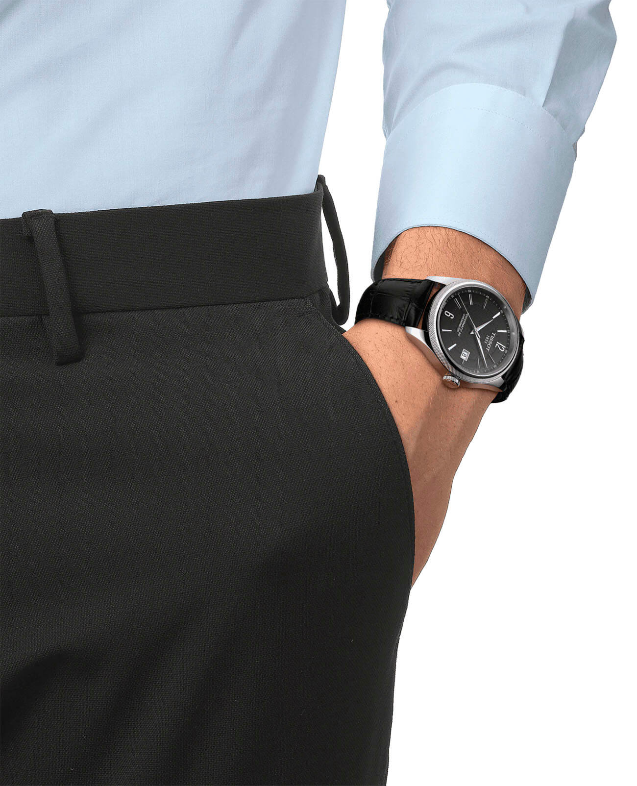 Серебристый безель и чёрный циферблат наделены привлекательным узором. Лаконичное исполнение идеально сочетается с ремешком из натуральной кожи с тиснением под кожу крокодила. Часы комплектуются автоматическим калибром Powermatic 80Powermatic 80Эксклюзивный калибр от швейцарской компании ETA с увеличенным запасом хода до 80 часов за счёт удлинённой заводной пружины. Характеризуется улучшенной системой спуска со сниженным трением., их высокая точность подтверждается сертификатом COSCСертификат COSCОфициальный сертификат, подтверждающий то, что часы ходят с особо высокой точностью. Для получения документа часы подвергаются тестовым испытаниям, разработанным швейцарским институтом тестирования хронометров COSC. Допустимая норма для механических часов -4/+6 секунд в день, для кварцевых моделей +/- 0,07 секунд в день.. Прозрачная задняя крышка. Сапфировое стекло. Водозащита 50 метров. . Окошко даты. Габариты: 39 x 41 x 9,8 мм.