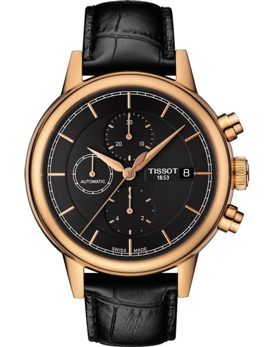 TISSOT T0854273606100 T-Classic Carson  - мужские механические наручные часы Корпус этих часов среднего размера (42,3 мм) и выполнен из нержавеющей стали L316 Модель TISSOT T0854273606100 T-Classic Carson имеет устойчивое к царапинам сапфировое стекло, ремешок из натуральной кожи черного цвета, черный циферблат Калибр механизма: C01211 Класс водозащиты: 30 м / 3 АТМ (защита от брызг и случайных капель) Дополнительные функции и особенности: отображение числа , секундомер, хронограф, запас хода до 45 часов Полная заводская комплектация TISSOT: оригинальные часы, фирменная коробка, инструкция, сервисная книжка, роман о часовой фабрике, миникаталог, замшевый фирменный чехол черного цвета для хранения и/или переноски часов, кассовый и товарный чеки Международная гарантия 2 года Производство и сборка: Швейцария