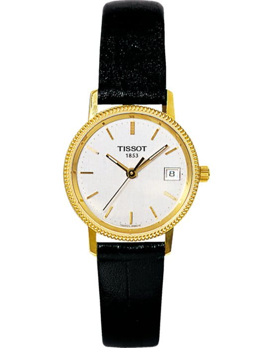 TISSOT T71311531 - женские кварцевые золотые наручные часы Корпус этих часов небольшого размера (24 мм) и выполнен из 18-каратного желтого золота  Модель TISSOT T71311531 имеет устойчивое к царапинам сапфировое стекло, кожаный ремешок , цвет циферблата белый Калибр механизма: ETA E61111 Класс водозащиты: 30 м /3 АТМ Дополнительные функции и особенности: отображение числа Полная заводская комплектация TISSOT: оригинальные часы, фирменная коробка, инструкция, сервисная книжка, роман о часовой фабрике, миникаталог, замшевый фирменный чехол черного цвета для хранения и/или переноски часов, кассовый и товарный чеки Международная гарантия 2 года Производство и сборка: Швейцария