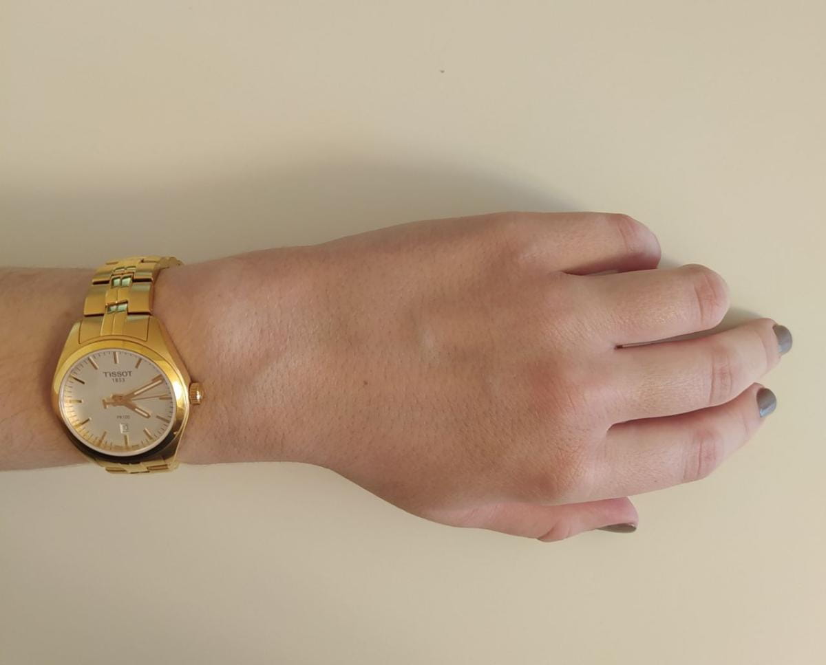 Часы являются воплощением традиций Tissot и элегантности, модель в цвете розового золота будет уместна на любом мероприятии. Такой оттенок образуется благодаря PVD-покрытиюPVDУльтратонкое покрытие наносится в технике вакуумного напыления, сочетает в себе нитрид титана особой прочности со слоем золота или оксида хрома. Несёт в себе декоративную или защитную функцию., устойчивому к царапинам и повреждениям. Кварцевый высокоточный калибр ETA F04.111. Сапфировое стекло. Люминесцентное покрытиеЛюминесцентное покрытиеПозволяет считывать показания времени в темноте. Производители наносят на стрелки, часовые индексы, безель или поверхность циферблата светонакопительный состав, дающий холодное свечение. стрелок. Водостойкость 100 метров. Застёжка бабочка с кнопками. Функционал: EOLEOLПредставляет собой систему, уведомляющую владельца часов о необходимости замены элемента питания. За 2 недели до полного разряда батарейки секундная стрелка перестаёт ходить чётко и начинает перепрыгивать на 3-4 деления., индикация даты. Габариты: 33 x 33 x 9 мм.