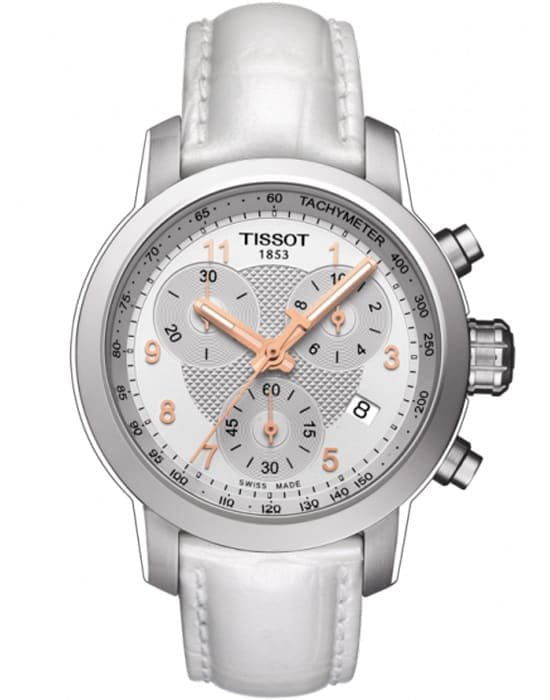 TISSOT T-Sport PRC 200 Quartz Chronograph - женские кварцевые наручные часы. Корпус этих часов среднего размера (35 мм) и выполнен из нержавеющей стали L316 металлического цвета. Модель имеет устойчивое к царапинам сапфировое стекло, ремешок из натуральной кожи белого цвета, белый циферблат. Калибр механизма: ETA G15.211. Класс водозащиты: 200 м / 20 АТМ (разрешается нырять с аквалангом на глубину). Дополнительные функции и особенности: отображение числа, хронограф (секундомер), тахиметр