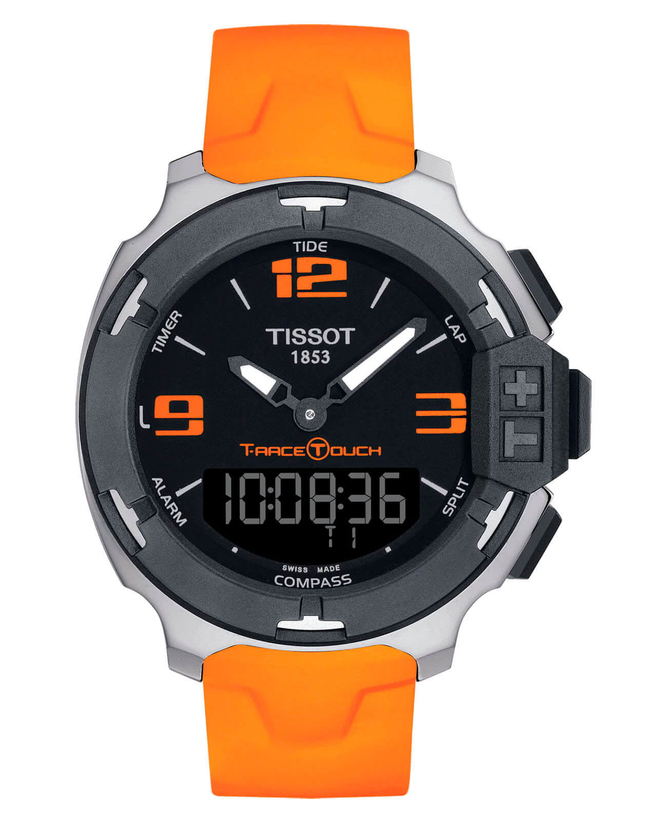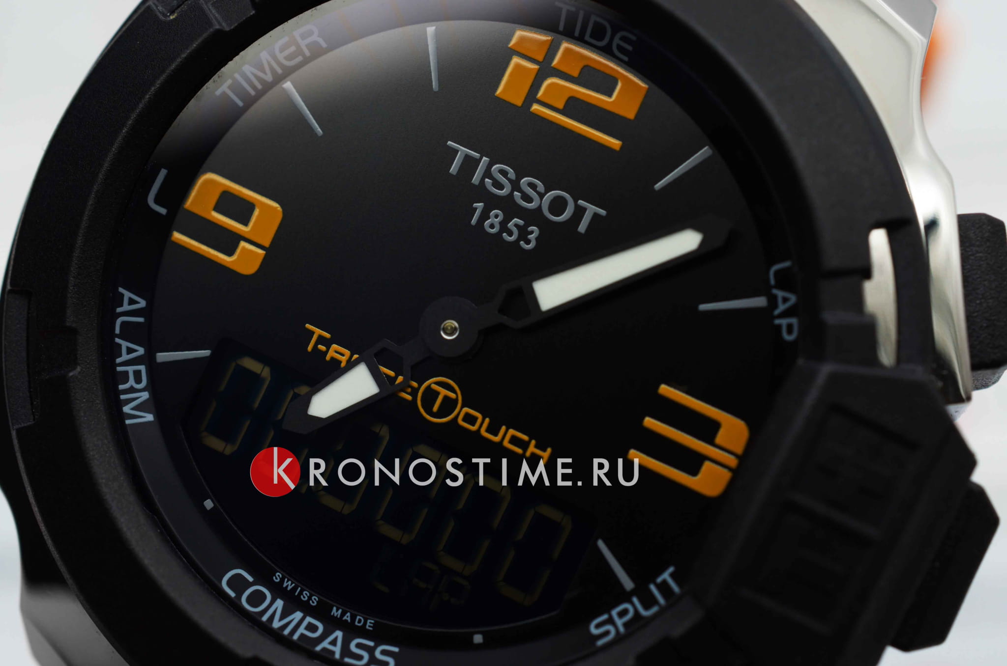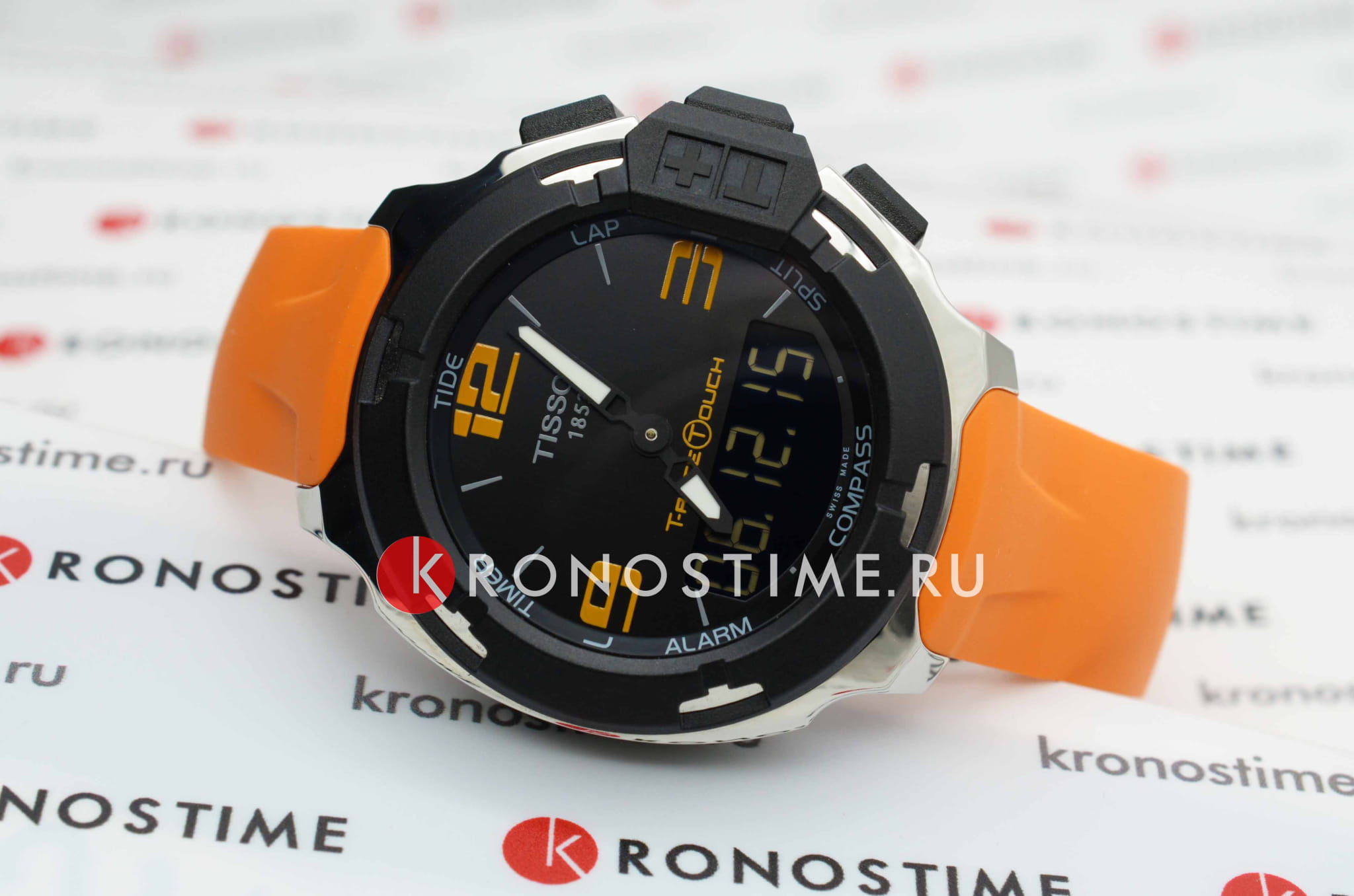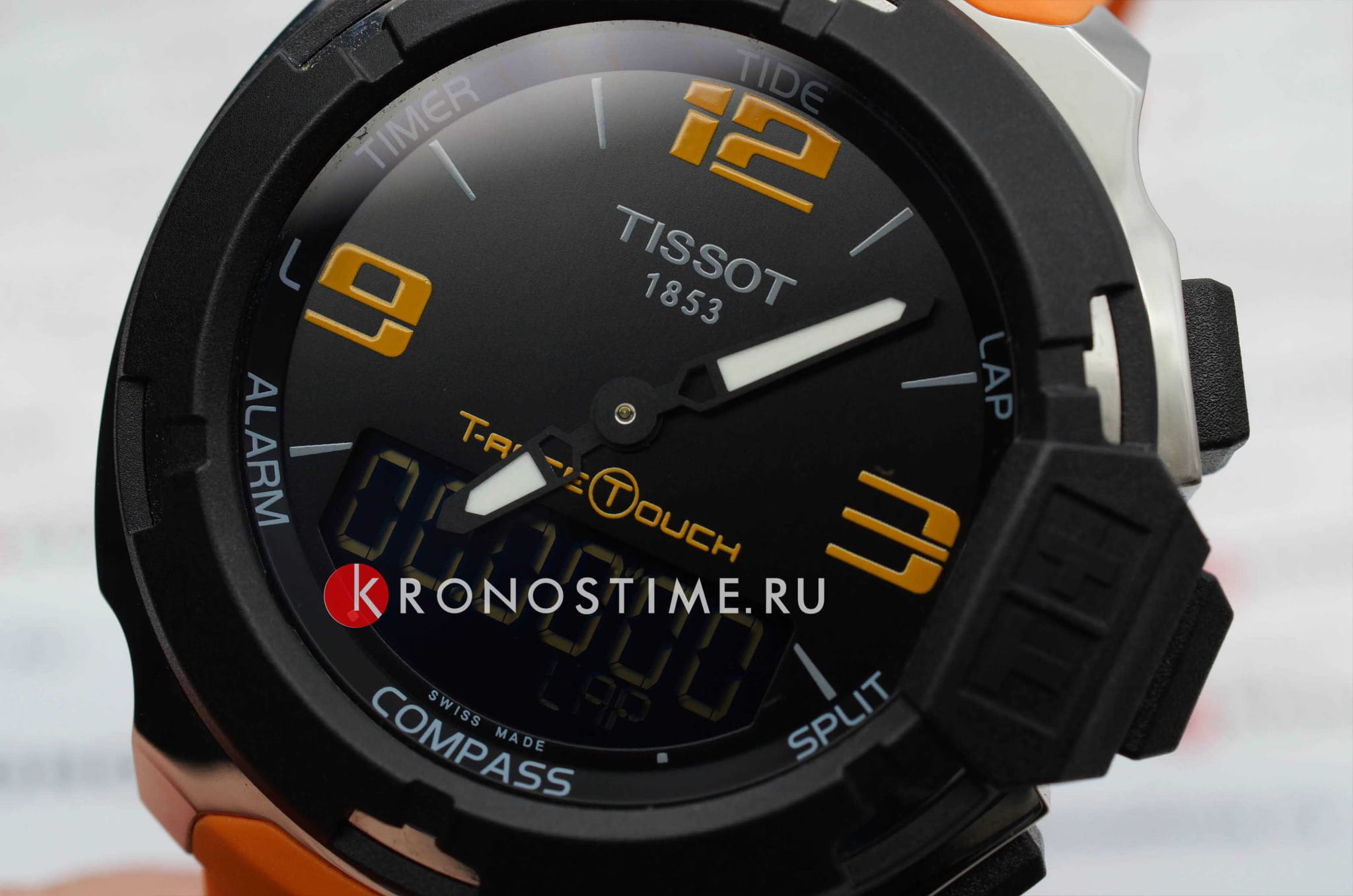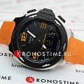 Наручные часы отличаются ярким исполнением, органично смотрятся оранжевый и чёрный цвет. Они имеют сенсорное сапфировое стеклоСапфировое стеклоПрочный и надёжный материал из кристалла сапфира синтетического происхождения, характеризующийся особой твёрдостью и устойчивостью к царапинам и повреждениям., позволяющее управлять всеми функциональными возможностями аксессуара. Среди них хронографХронографФункция позволяет измерять отрезки времени с особой точностью: часы, минуты, секунды. Верным признаком хронографа является наличие на циферблате 3 дополнительных окошек-счётчиков., компас, календарь приливов и отливов, GMTGMTОтображение времени второго часового пояса.Такая функция особенно актуальна для путешественников и бизнесменов,которые общаются с людьми из разных стран,теперь вы всегда будете знать,какой час у вашего партнёра или близкого человека., таймерТаймерОтсчитывает секунды в обратном направлении в заданном интервале времени., будильник. Модель поможет не растеряться в путешествии и выдерживать городской ритм. Кварцевый швейцарский механизм ETA E49.301. Водостойкость 10 бар. Прочный каучуковый ремешок. Габариты: 42,15 x 42,15 x 13,5 мм.