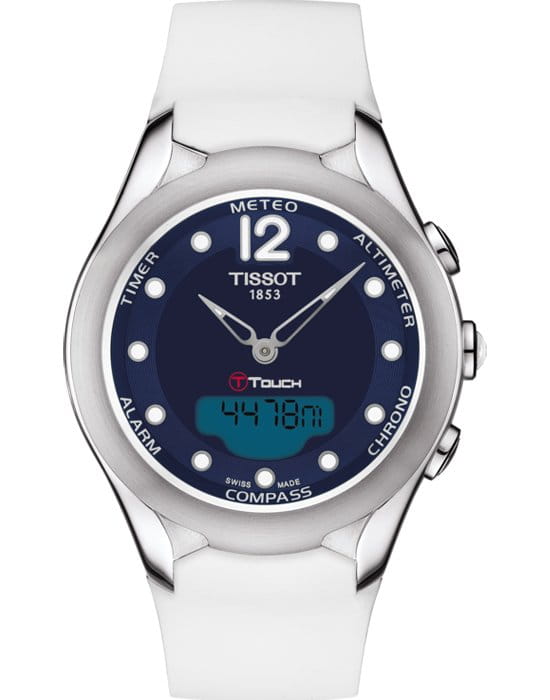 Лаконичный спортивный стиль придётся по душе каждой. Это наручные часы с сенсорным экраном синего цвета, управление возможностями которого происходит благодаря тактильному сапфировому стеклу, поверхность которого имеет антибликовое покрытие. Функции: GMTGMTОтображение времени второго часового пояса.Такая функция особенно актуальна для путешественников и бизнесменов,которые общаются с людьми из разных стран,теперь вы всегда будете знать,какой час у вашего партнёра или близкого человека., высотомер, компас, будильник, вечный календарьВечный календарьКлассическое часовое усложнение, представляющее собой календарь, рассчитанный на несколько лет вперёд (стандартно – до 2099 года). Определяет текущую дату, день недели, месяц., секундомер, хронографХронографФункция позволяет измерять отрезки времени с особой точностью: часы, минуты, секунды. Верным признаком хронографа является наличие на циферблате 3 дополнительных окошек-счётчиков.. Кварцевый механизм ETA E81.301. Получение энергии от солнечного света . Белый ремешок из силиконового материала. Водозащита до 10 бар. EOLEOLПредставляет собой систему, уведомляющую владельца часов о необходимости замены элемента питания. За 2 недели до полного разряда батарейки секундная стрелка перестаёт ходить чётко и начинает перепрыгивать на 3-4 деления.. Габариты: 38 x 39,5 x 12,1 мм.