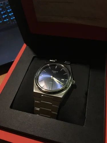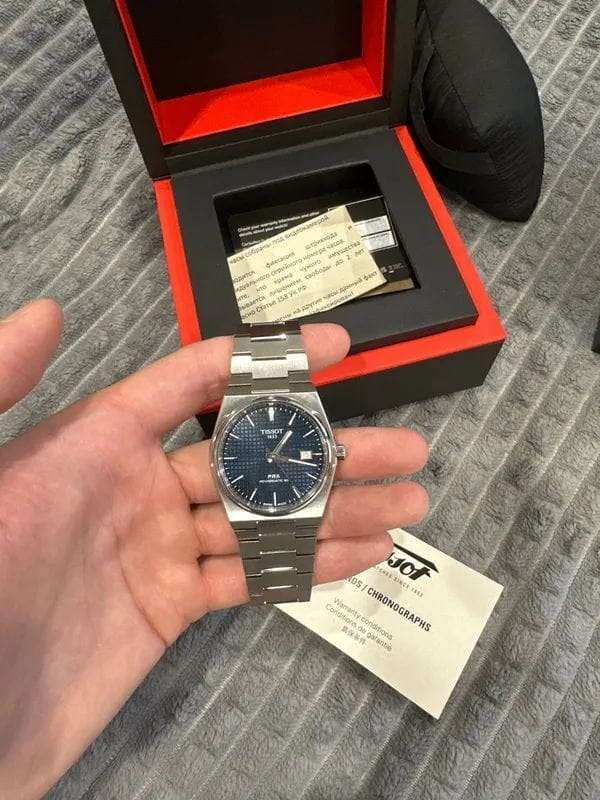 Tissot PRX 40mm (модель T137.410.11.041.00) – элегантные мужские часы, сочетающие стильный дизайн и надёжность. Корпус диаметром 40 мм выполнен из нержавеющей стали 316L, что обеспечивает долговечность и комфорт при ношении. Синий циферблат с эффектом солнечных лучей защищён сапфировым стекломСапфировое стеклоПрочный и надёжный материал из кристалла сапфира синтетического происхождения, характеризующийся особой твёрдостью и устойчивостью к царапинам и повреждениям., устойчивым к царапинам.