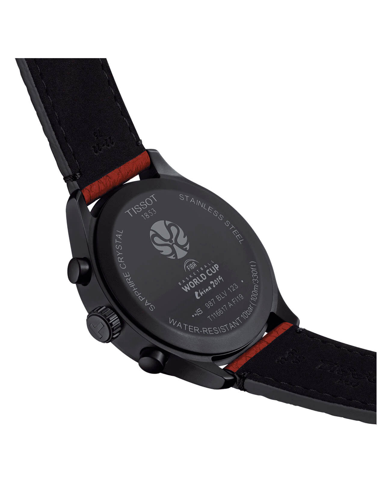 Часы привлекают броским спортивным дизайном, расставлены красные акценты в виде тонкой секундной стрелки и стрелок счётчика хронографаХронографФункция позволяет измерять отрезки времени с особой точностью: часы, минуты, секунды. Верным признаком хронографа является наличие на циферблате 3 дополнительных окошек-счётчиков.. Они посвящаются 18-му чемпионату мира по баскетболу под эгидой ФИБА, о чём рассказывает и логотип на задней крышке. Оригинальный ремешок из натуральной кожи напоминает нам о баскетбольных мячах. Кварцевый механизм ETA G10.212. Водонепроницаемость 10 бар. Чёрное PVD-покрытиеPVDУльтратонкое покрытие наносится в технике вакуумного напыления, сочетает в себе нитрид титана особой прочности со слоем золота или оксида хрома. Несёт в себе декоративную или защитную функцию. корпуса. Надёжное сапфировое стекло. Габариты: 45 x 45 x 12,5 мм.
