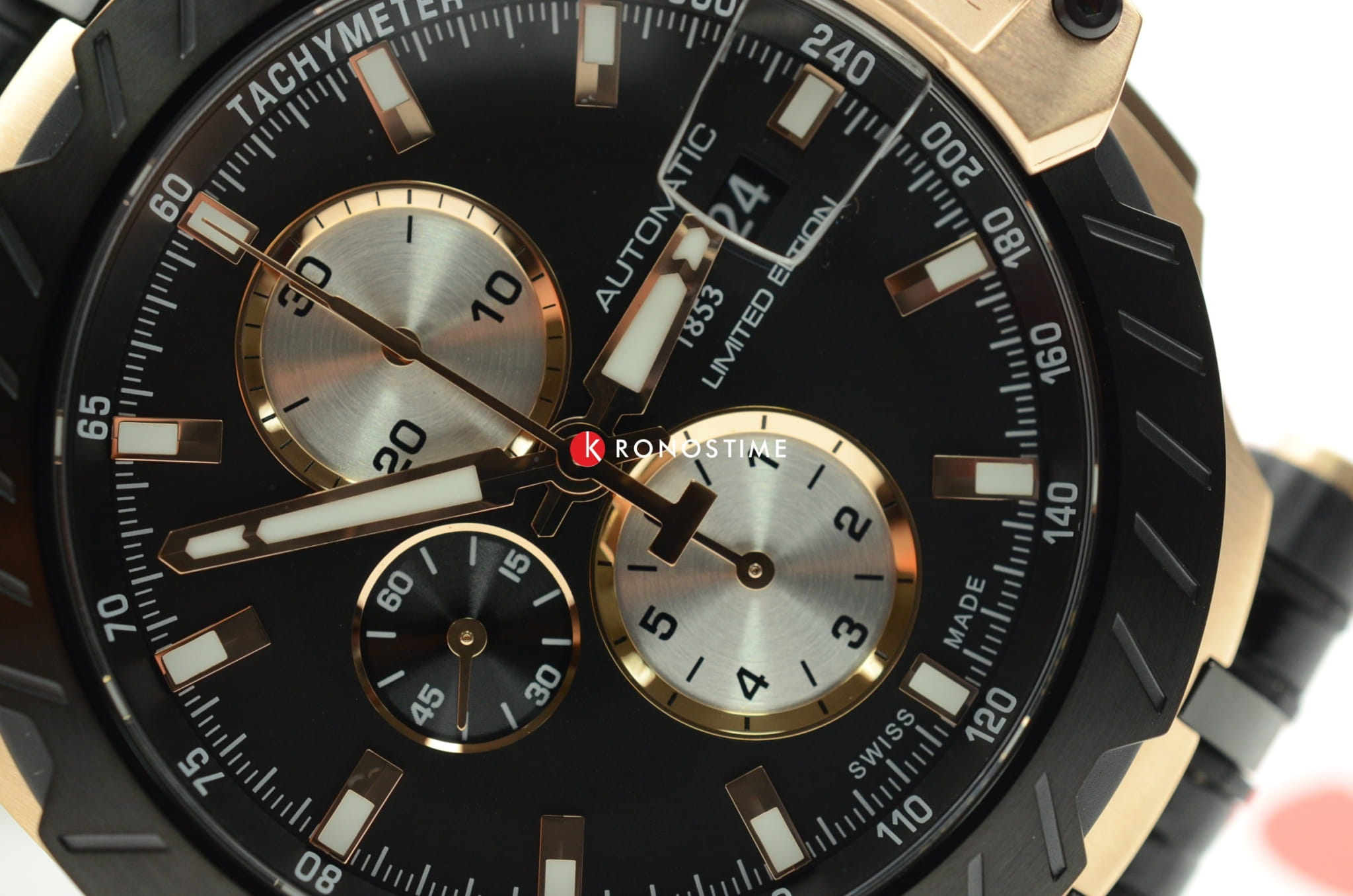 Наручные часы с чемпионским характером и стилистикой MotoGP выпускаются лимитированным тиражом, всего существует 3333 экземпляра. На нижней части задней крышки, выполненной в виде колеса, выгравирован индивидуальный номер. Модель дополнена механизмом C01.211 с запасом хода 45 часов. Корпус из хирургической стали с PVD-покрытиемPVDУльтратонкое покрытие наносится в технике вакуумного напыления, сочетает в себе нитрид титана особой прочности со слоем золота или оксида хрома. Несёт в себе декоративную или защитную функцию. цвета розового золота. Водостойкость до 10 бар. Кожаный ремешок с внутренней стороной из каучука. Антибликовое покрытие на поверхности сапфирового стекла. Оригинальная упаковка в виде мотошлема. Секундомер, тахиметрТахиметрРазмеченная шкала, располагается на ободке или безеле часов. Тахиметр позволяет рассчитать скорость на определённом участке пути, расстояние измеряется в километрах или милях., календарь. Габариты: 48,8 x 45 x 16,6 мм.
