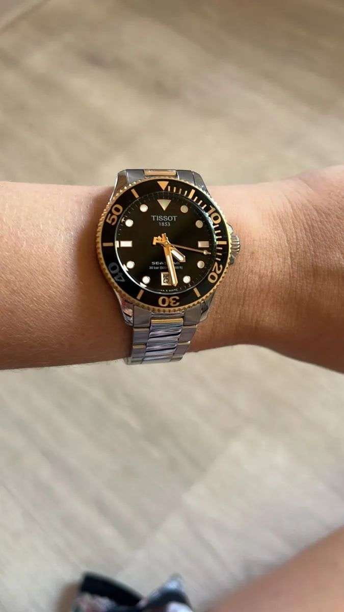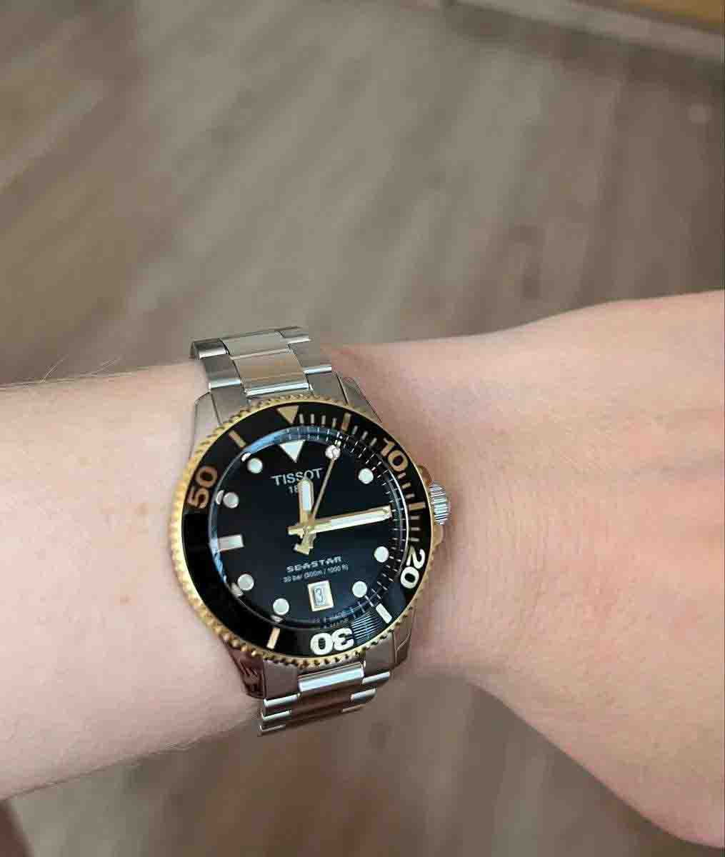 Модель T120.210.21.051.00 — женский швейцарский дайвер с корпусом 36 мм из 316L нержавеющей стали с золотистым PVD-покрытиемPVDУльтратонкое покрытие наносится в технике вакуумного напыления, сочетает в себе нитрид титана особой прочности со слоем золота или оксида хрома. Несёт в себе декоративную или защитную функцию. и браслетом из того же материала. Надёжный швейцарский кварцевый механизм гарантирует точность, а водонепроницаемость до 30 bar (300 м) позволяет погружаться без опасений. Чёрный циферблат защищён сапфировым стекломСапфировое стеклоПрочный и надёжный материал из кристалла сапфира синтетического происхождения, характеризующийся особой твёрдостью и устойчивостью к царапинам и повреждениям. с антибликовым покрытиемАнтибликовое покрытиеСлой оксида металла в 0,13-0,3 микрон, благодаря которому стекло часов не бликует и не отражает свет. Антибликовое покрытие уменьшает отражение света в 10 раз, обеспечивая отличную читаемость показателей циферблата.. Удобная раскладная застёжкаРаскладная застёжкаТакой тип застёжки используется только на браслетах из металла. Она никогда не раскрывается полностью, происходит разделение на 2 и более частей. Раскладывающая застёжка снизит вероятность потери часов к минимуму. и uni-directional вращающийся безель подчёркивают профессиональный характер модели.