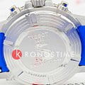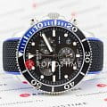 Наручные часы отличаются спортивным дизайном, прослеживается дайверская тематика, чему способствует и водонепроницаемость при давлении 30 бар на глубине 300 метров. Кварцевый механизм ETA G10.212. Керамический безельБезельВнешний ободок, закрепляющий стекло. В спортивных часах так называется поворотное кольцо с делениями на циферблате, выполняет роль таймера – замеряет отрезки времени на шкале. Неподвижный безель – элемент декора. Однонаправленно вращающийся безель на дайверских часах позволяет фиксировать моменты погружения и выныривания на поверхность. Сапфировое стекло с антибликовым покрытием. Завинчивающаяся заводная головка и задняя крышка. Люминесцентная подсветкаЛюминесцентное покрытиеПозволяет считывать показания времени в темноте. Производители наносят на стрелки, часовые индексы, безель или поверхность циферблата светонакопительный состав, дающий холодное свечение.. Черно-синий тканевый ремешок. Секундомер, хронографХронографФункция позволяет измерять отрезки времени с особой точностью: часы, минуты, секунды. Верным признаком хронографа является наличие на циферблате 3 дополнительных окошек-счётчиков., календарь. Габариты: 45 x 45 x 12,8 мм.