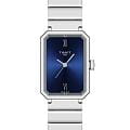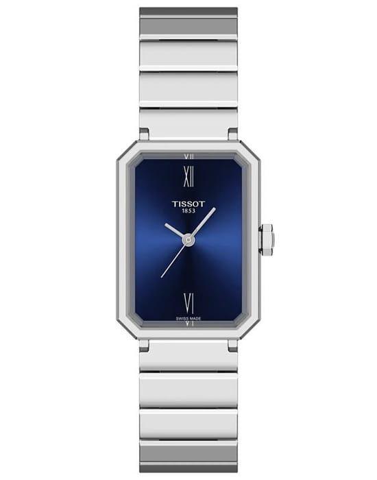 Tissot SRV 30mm — утончённая модель в винтажном стиле с элегантным акцентом. Корпус прямоугольной формы серебристого цвета, что придаёт часам благородный облик. Синий циферблат с лаконичными метками в виде точек подчёркивает минималистичный характер модели, а за точность отвечает швейцарский кварцевый механизм. Циферблат защищён сапфировым стекломСапфировое стеклоПрочный и надёжный материал из кристалла сапфира синтетического происхождения, характеризующийся особой твёрдостью и устойчивостью к царапинам и повреждениям., стойким к царапинам. Часы дополнены стальным браслетом на застёжке-бабочке с кнопкамиЗастёжка "бабочка"Такой вид застёжки дополняется предохранителями, помогающими избежать случайного раскрытия браслета. Обладают изящным исполнением. , что обеспечивает комфортную посадку на запястье и гармонично завершает дизайн.