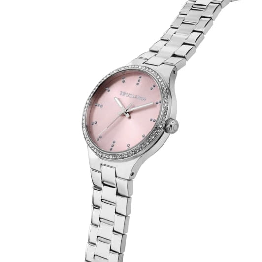 Итальянские женские часы Trussardi T-Essenzat R2453172505 - это стильный женский аксессуар, который сочетает элегантный дизайн и практичность. Корпус выполнен из нержавеющей стали с безелемБезельВнешний ободок, закрепляющий стекло. В спортивных часах так называется поворотное кольцо с делениями на циферблате, выполняет роль таймера – замеряет отрезки времени на шкале. Неподвижный безель – элемент декора. Однонаправленно вращающийся безель на дайверских часах позволяет фиксировать моменты погружения и выныривания на поверхность. с кристаллами , что обеспечивает долговечность и утончённый внешний вид. Надежное минеральное стеклоМинеральное стеклоМинеральное стекло представляет собой искусственно выращенный минерал кварца. Такое стекло отличается особой устойчивостью к повреждениям и царапинам. Уступает по некоторым качествам сапфировому стеклу. защищает циферблат от царапин и обеспечивает долговечность. Модель оснащена кварцевым механизмом, обеспечивающим высокую точность хода. Браслет из нержавеющей стали на раскладной застёжкеРаскладная застёжкаТакой тип застёжки используется только на браслетах из металла. Она никогда не раскрывается полностью, происходит разделение на 2 и более частей. Раскладывающая застёжка снизит вероятность потери часов к минимуму. обеспечивает комфортное ношение. Стрелки с люминесцентным покрытиемЛюминесцентное покрытиеПозволяет считывать показания времени в темноте. Производители наносят на стрелки, часовые индексы, безель или поверхность циферблата светонакопительный состав, дающий холодное свечение.. Водозащита 50 метров позволит защитить корпус от случайных брызг или капель дождя. Эта модель – отличный выбор для тех, кто ищет сочетание стиля, качества и функциональности. Часы станут не только полезным аксессуаром, но и выразительным элементом вашего имиджа.