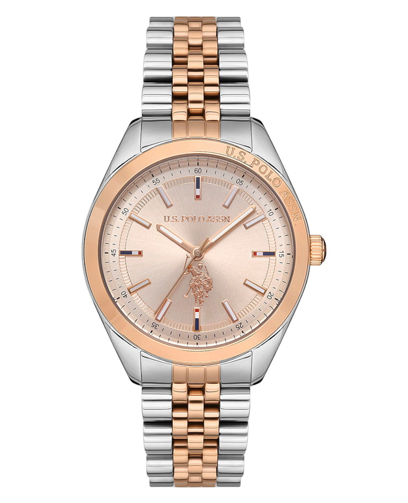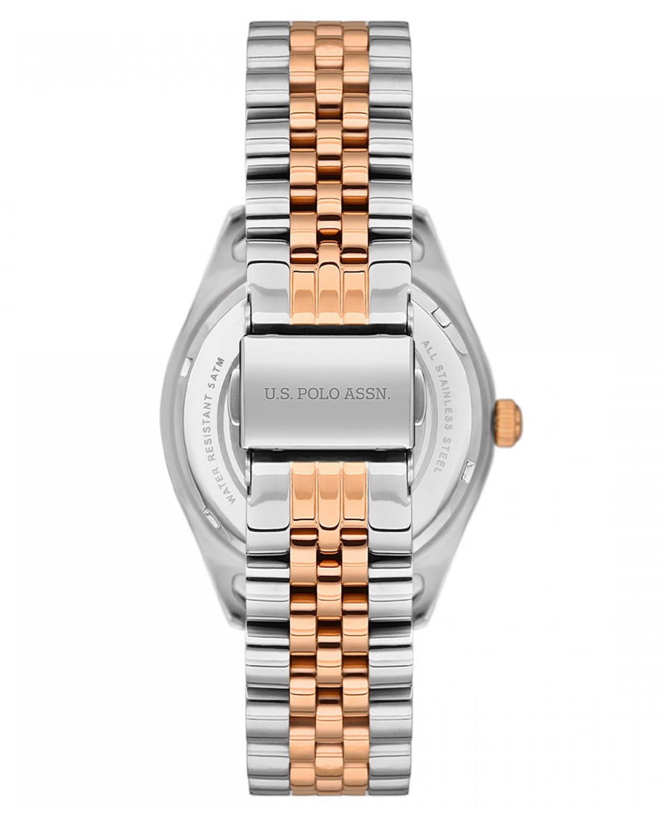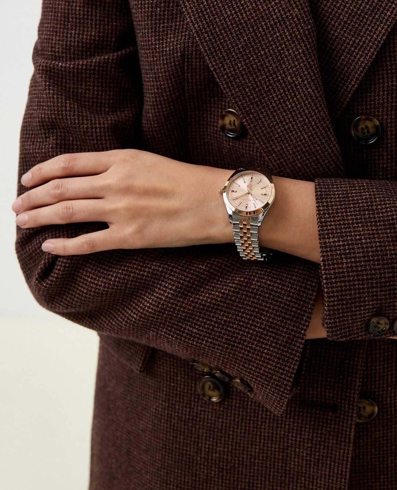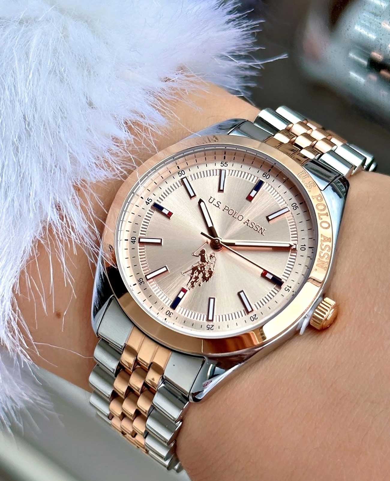 Женские часы U.S. Polo Assn. Fundamental USPA2041-08, кварцевый механизм с высокой точностью. Минеральное стеклоМинеральное стеклоМинеральное стекло представляет собой искусственно выращенный минерал кварца. Такое стекло отличается особой устойчивостью к повреждениям и царапинам. Уступает по некоторым качествам сапфировому стеклу. устойчивое к появлению царапин, обладающее высокой прозрачностью. Корпус изготовлен из нержавеющей стали. БезельБезельВнешний ободок, закрепляющий стекло. В спортивных часах так называется поворотное кольцо с делениями на циферблате, выполняет роль таймера – замеряет отрезки времени на шкале. Неподвижный безель – элемент декора. Однонаправленно вращающийся безель на дайверских часах позволяет фиксировать моменты погружения и выныривания на поверхность. из нержавеющей стали с IP-покрытиемIP-покрытиеМетод ионного напыления. Демонстрирует повышенную устойчивость к истиранию, окислению и химическим веществам. Под воздействием высокого давления и температуры около 1500°C молекулы металла надёжно соединяются с частицами корпуса часов.. Стрелки и метки с люминесцентным покрытиемЛюминесцентное покрытиеПозволяет считывать показания времени в темноте. Производители наносят на стрелки, часовые индексы, безель или поверхность циферблата светонакопительный состав, дающий холодное свечение.. Класс водозащиты: 50 метров, позволит защитить корпус от случайных брызг или капель дождя. Стальной браслет с частичным IP-покрытиемIP-покрытиеМетод ионного напыления. Демонстрирует повышенную устойчивость к истиранию, окислению и химическим веществам. Под воздействием высокого давления и температуры около 1500°C молекулы металла надёжно соединяются с частицами корпуса часов. на застёжке «бабочка» с кнопкамиЗастёжка "бабочка"Такой вид застёжки дополняется предохранителями, помогающими избежать случайного раскрытия браслета. Обладают изящным исполнением. .