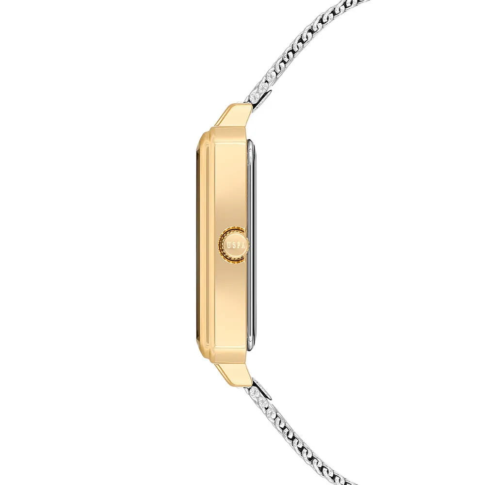 Женские элегантные часы U.S. Polo Assn. Stile USPA2083-05, кварцевый механизм с высокой точностью. Минеральное стеклоМинеральное стеклоМинеральное стекло представляет собой искусственно выращенный минерал кварца. Такое стекло отличается особой устойчивостью к повреждениям и царапинам. Уступает по некоторым качествам сапфировому стеклу. устойчивое к появлению царапин, обладающее высокой прозрачностью. Изысканный корпус изготовлен из нержавеющей стали с IP-покрытиемIP-покрытиеМетод ионного напыления. Демонстрирует повышенную устойчивость к истиранию, окислению и химическим веществам. Под воздействием высокого давления и температуры около 1500°C молекулы металла надёжно соединяются с частицами корпуса часов.. Лаконичные золотистые центральные часовая, минутная и секундная стрелки. Водонепроницаемость 3 АТМ позволяет использовать часы в повседневных условиях — при мытье рук или под лёгким дождём. Браслет выполнен в технике миланской сетки из стали и оснащён раскладным замкомРаскладной замокДанный вариант застежки используется только на часах с металлическим браслетом. Отличительная особенность такого крепления в том, что длина браслета становится универсальной и вы можете самостоятельно отрегулировать нужный вам размер – застежка просто двигается по браслету часов., обеспечивающей комфорт и уверенную фиксацию на запястье, а также добавляя завершающий штрих к этому стильному аксессуару. Циферблат с кристаллами подчёркивает изысканный характер часов, создавая универсальный образ, подходящий как для повседневных ситуаций, так и для особых случаев.