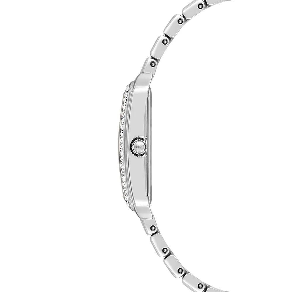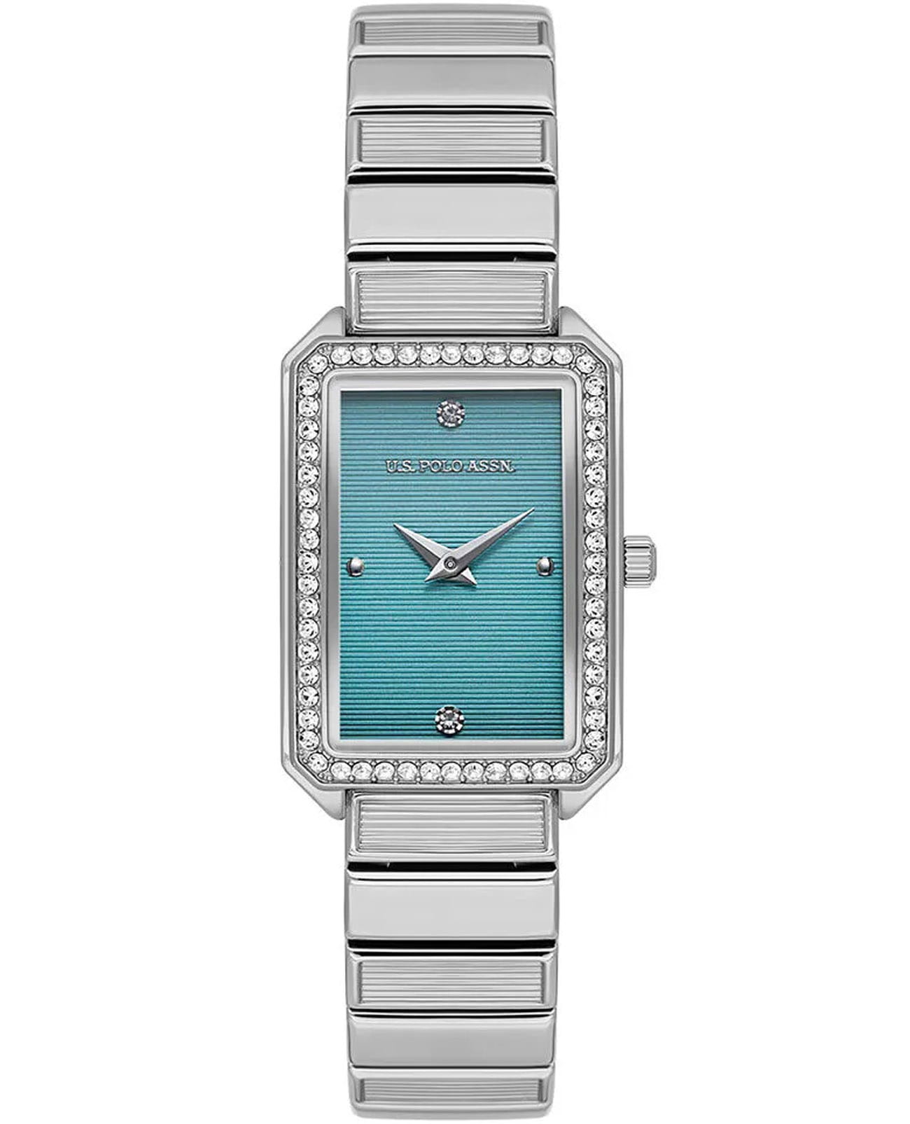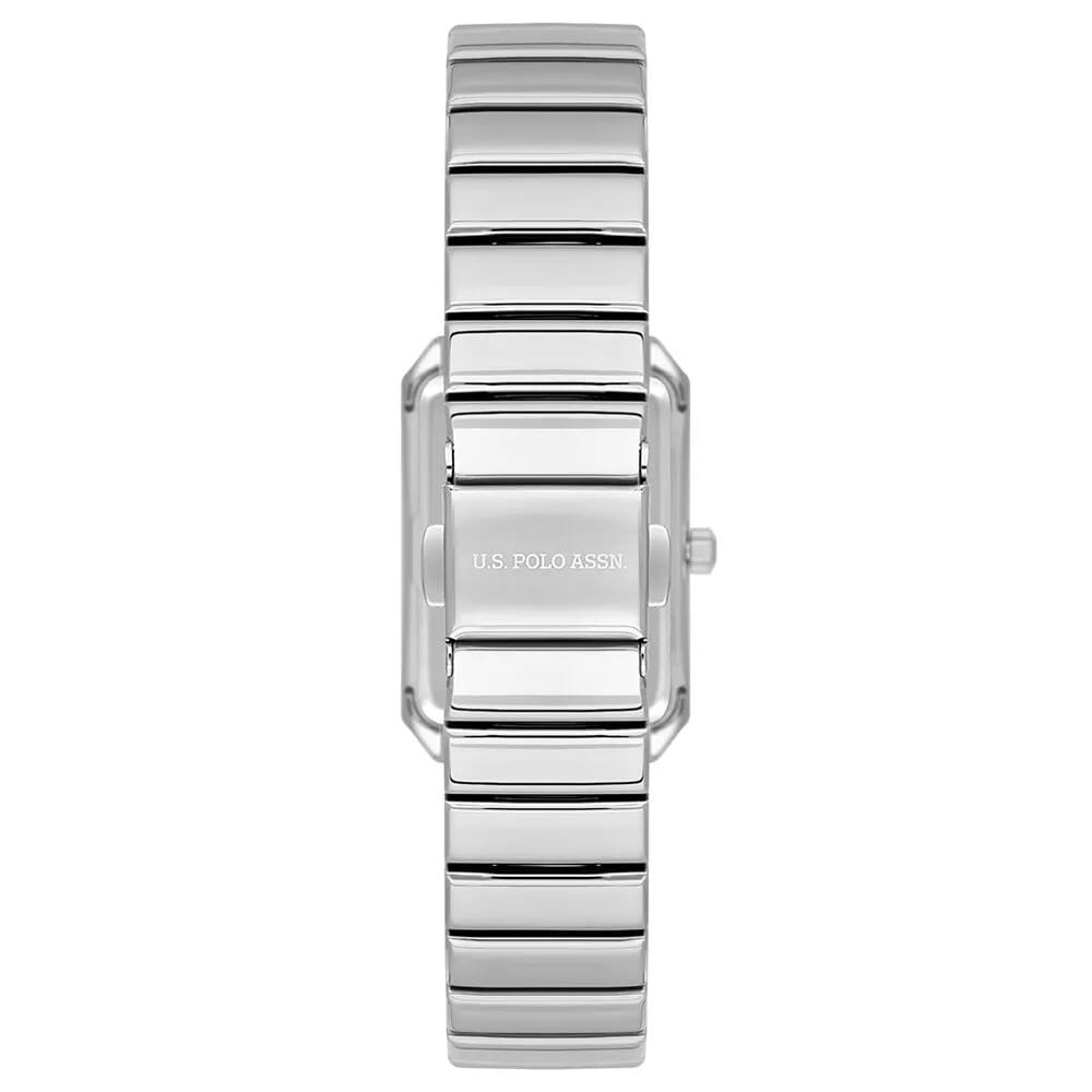 Женские наручные часы U.S. Polo Assn. Stile USPA2108-02 — это стильный и лаконичный аксессуар, выполненный в форме квадрата. Модель изготовлена из стали серебристого цвета, а безельБезельВнешний ободок, закрепляющий стекло. В спортивных часах так называется поворотное кольцо с делениями на циферблате, выполняет роль таймера – замеряет отрезки времени на шкале. Неподвижный безель – элемент декора. Однонаправленно вращающийся безель на дайверских часах позволяет фиксировать моменты погружения и выныривания на поверхность. украшен изысканными кристаллами, придающими часам роскошный вид. Циферблат с лаконичными центральными часовой и минутной стрелками. Защиту циферблата обеспечивает минеральное стеклоМинеральное стеклоМинеральное стекло представляет собой искусственно выращенный минерал кварца. Такое стекло отличается особой устойчивостью к повреждениям и царапинам. Уступает по некоторым качествам сапфировому стеклу., устойчивое к мелким повреждениям. Часы оснащены кварцевым механизмом, гарантирующим точность и минимальное обслуживание. Водонепроницаемость 3 АТМ позволяет использовать часы в повседневных условиях — при мытье рук или под лёгким дождём. Браслет выполнен из стали и оснащён раскладной застёжкойРаскладная застёжкаТакой тип застёжки используется только на браслетах из металла. Она никогда не раскрывается полностью, происходит разделение на 2 и более частей. Раскладывающая застёжка снизит вероятность потери часов к минимуму., обеспечивающей комфорт и уверенную фиксацию на запястье. Толщина корпуса составляет 8 мм, а его размер 23 мм, что делает часы компактными и удобными в носке. Эти часы станут универсальным аксессуаром для уверенных в себе женщин, которые ценят сочетание стиля, качества и эстетики — идеальный выбор для повседневного образа и торжественных случаев.
