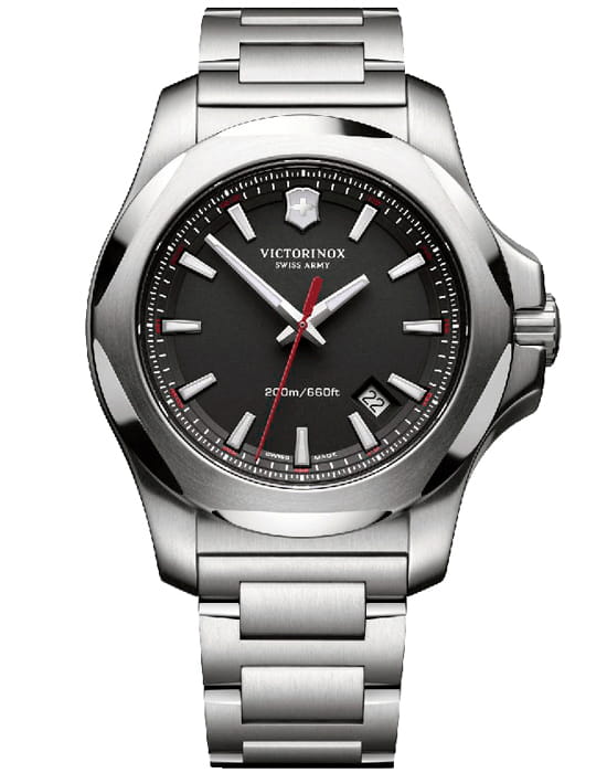 Мужские швейцарские часы Victorinox I.N.O.X. 241723.1. Сапфировое стеклоСапфировое стеклоПрочный и надёжный материал из кристалла сапфира синтетического происхождения, характеризующийся особой твёрдостью и устойчивостью к царапинам и повреждениям. с трёхслойным антибликовым покрытием. Корпус часов выполнен из нержавеющей стали 316L. Стальной браслет на раскладной застёжкеРаскладная застёжкаТакой тип застёжки используется только на браслетах из металла. Она никогда не раскрывается полностью, происходит разделение на 2 и более частей. Раскладывающая застёжка снизит вероятность потери часов к минимуму.. Влагозащита: 200 метров, позволит плавать, нырять и заниматься другими водными видами спорта. Окошко даты находится в положении между 4 и 5 часов. Стрелки и метки с люминесцентным покрытиемЛюминесцентное покрытиеПозволяет считывать показания времени в темноте. Производители наносят на стрелки, часовые индексы, безель или поверхность циферблата светонакопительный состав, дающий холодное свечение..