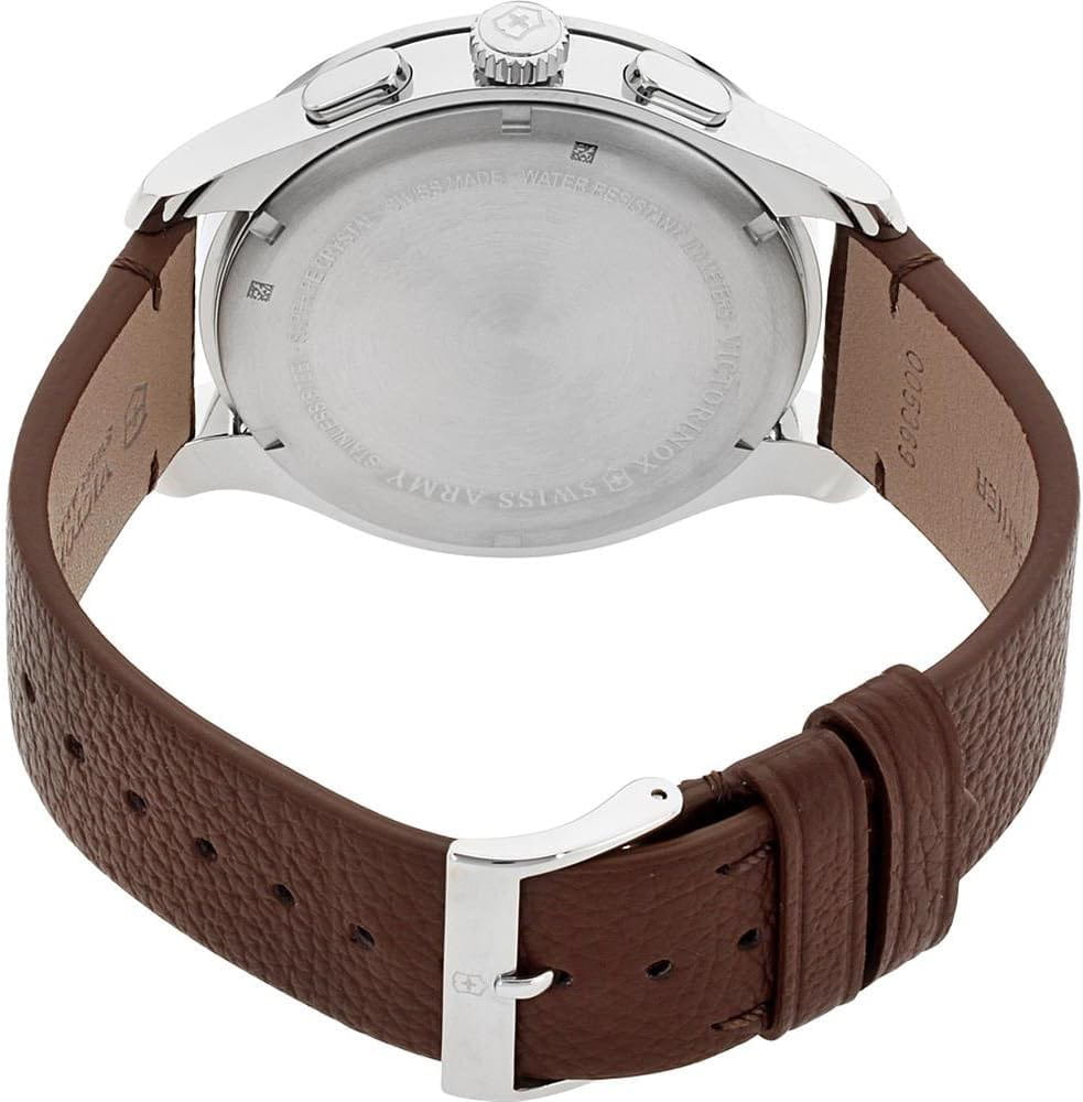 Мужские часы-хронографХронографФункция позволяет измерять отрезки времени с особой точностью: часы, минуты, секунды. Верным признаком хронографа является наличие на циферблате 3 дополнительных окошек-счётчиков. Victorinox Alliance Chronograph 241749, кварцевый механизм с высокой точностью. Сапфировое стеклоСапфировое стеклоПрочный и надёжный материал из кристалла сапфира синтетического происхождения, характеризующийся особой твёрдостью и устойчивостью к царапинам и повреждениям. с тройным антибликовым покрытием. Корпус часов изготовлен из нержавеющей стали. Накладные полированные клиновидные индексы. Стрелки и метки с люминесцентным покрытиемЛюминесцентное покрытиеПозволяет считывать показания времени в темноте. Производители наносят на стрелки, часовые индексы, безель или поверхность циферблата светонакопительный состав, дающий холодное свечение.. Окошко даты находится в положении 6 часов. Завинчивающаяся задняя крышка. Класс водозащиты: 100 метров, позволит плавать, нырять и заниматься другими водными видами спорта. Кожаный ремешок на стандартной застежке.