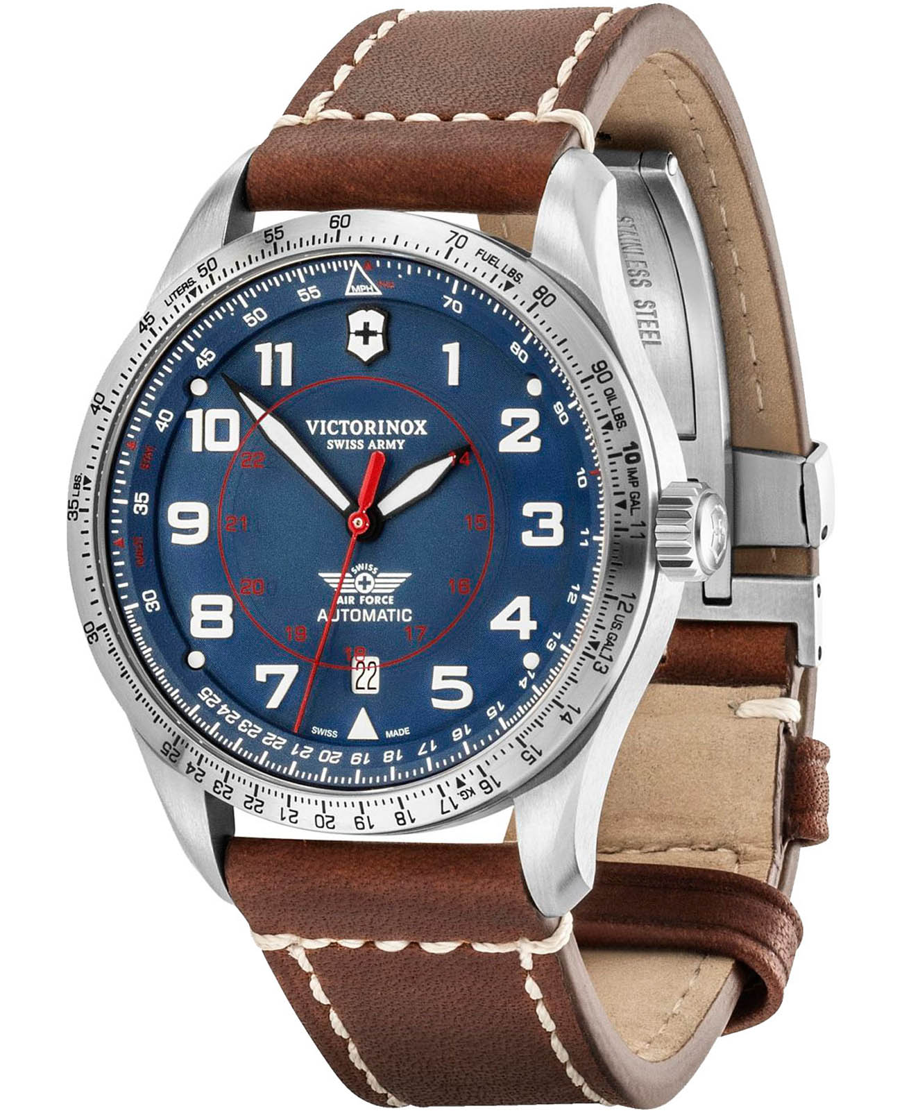 Мужские механические часы Victorinox AirBoss 241887. Корпус часов изготовлен из нержавеющей стали. Сапфировое стеклоСапфировое стеклоПрочный и надёжный материал из кристалла сапфира синтетического происхождения, характеризующийся особой твёрдостью и устойчивостью к царапинам и повреждениям. с тройным антибликовым покрытием. Практичный кожаный ремешок с раскладной застёжкойРаскладная застёжкаТакой тип застёжки используется только на браслетах из металла. Она никогда не раскрывается полностью, происходит разделение на 2 и более частей. Раскладывающая застёжка снизит вероятность потери часов к минимуму.. Стрелки и метки с люминесцентным покрытиемЛюминесцентное покрытиеПозволяет считывать показания времени в темноте. Производители наносят на стрелки, часовые индексы, безель или поверхность циферблата светонакопительный состав, дающий холодное свечение.. БезельБезельВнешний ободок, закрепляющий стекло. В спортивных часах так называется поворотное кольцо с делениями на циферблате, выполняет роль таймера – замеряет отрезки времени на шкале. Неподвижный безель – элемент декора. Однонаправленно вращающийся безель на дайверских часах позволяет фиксировать моменты погружения и выныривания на поверхность. с логарифмической линейкой. Эта функция позволяет измерять такие метрические параметры, как объем, скорость, расстояние и расход топлива, и конвертировать различные переменные. Окошко даты находится в положении 6 часов.